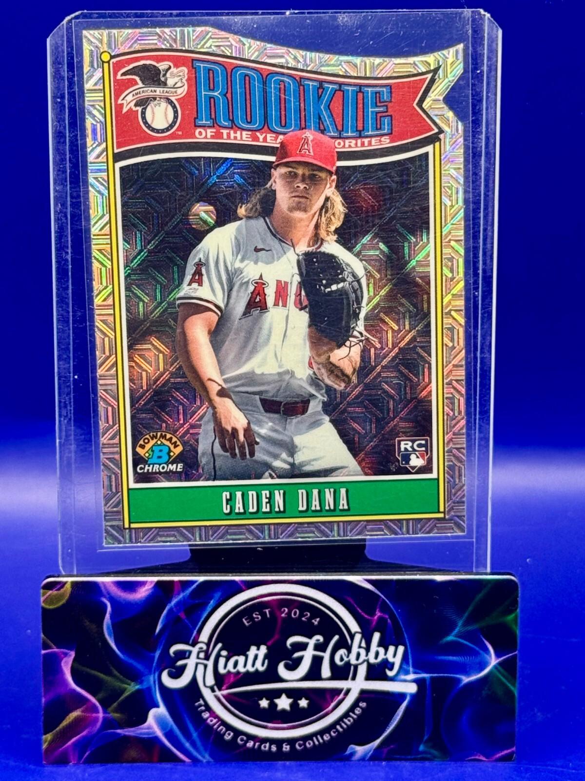 The 2025 Bowman Chrome Caden Dana #ROY-7 ROY Favorites Mojo Refractor trading card is a sought-after collectible item in the sports trading card market. Manufactured by Topps, this original MLB baseball card features the Rookie of the Year Favorites insert set and a unique Mojo Refractor parallel variety. With its standard card size and English language, this card showcases Caden Dana from the Los Angeles Angels as a potential future baseball star. Perfect for fans of the MLB World Series and collectors of baseball memorabilia, this card is a valuable addition to any collection.