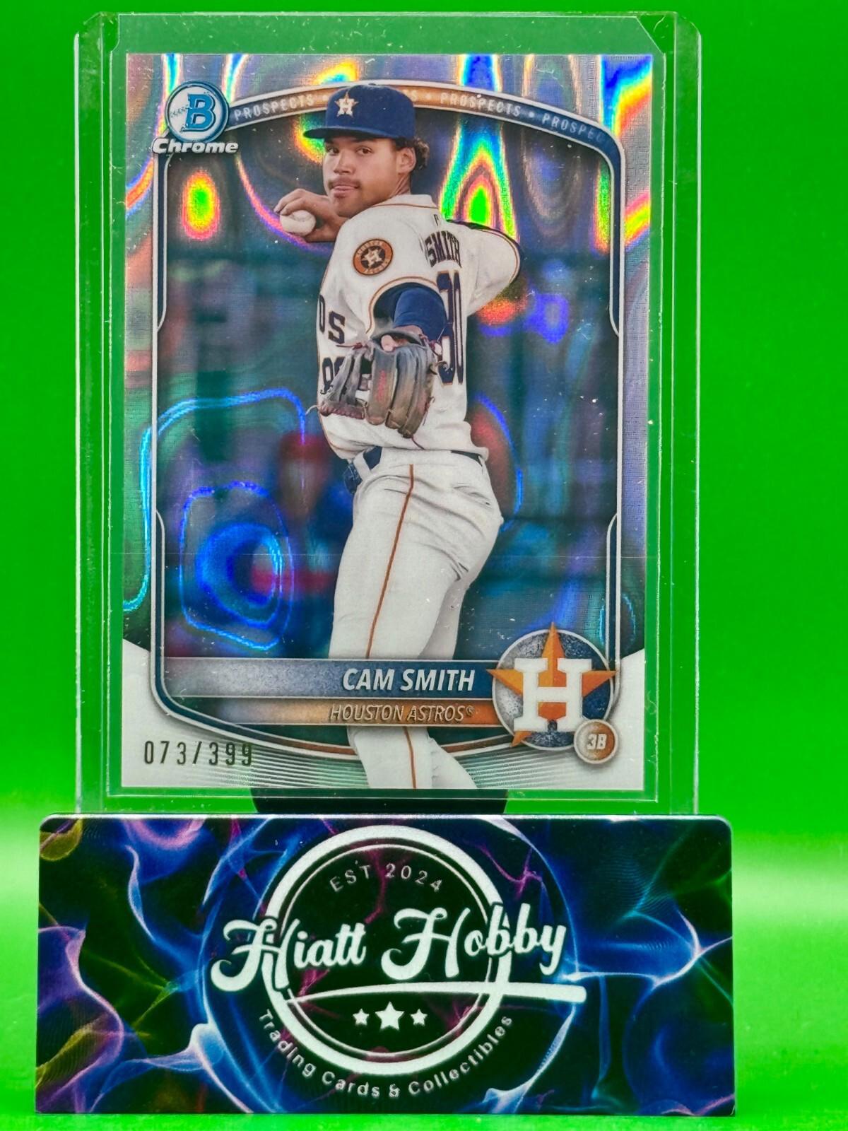 This 2025 Bowman Chrome sports trading card features Cam Smith of the Houston Astros team. The card is made of standard card stock material and is an original, licensed reprint from Topps. It is a Lava refractor card with a serial number, making it a unique and rare addition to any baseball card collection. The card is part of the 2025 Bowman Chrome set and is sized to fit standard card holders. It is an official MLB World Series event/tournament card and is written in English. The card is suitable for Major League (MLB) fans and collectors alike.