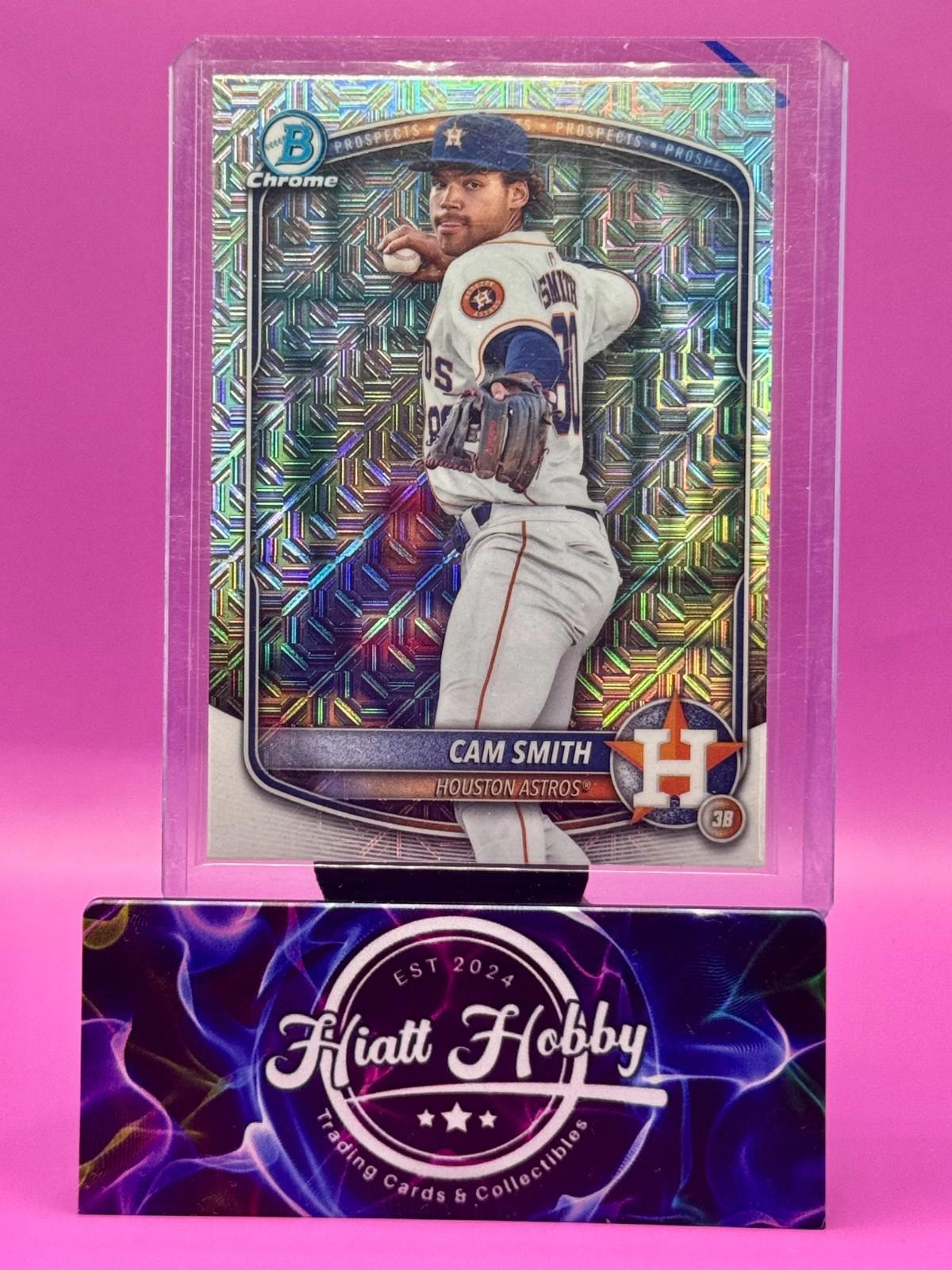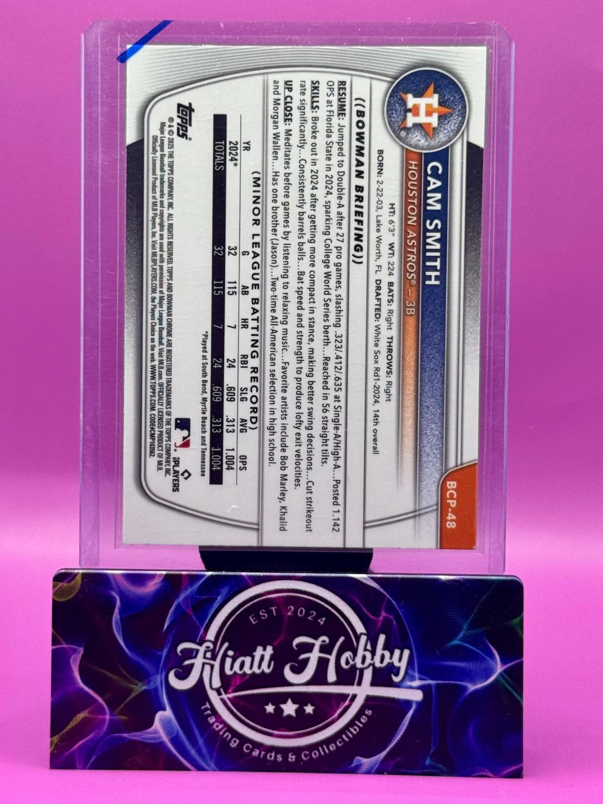 The 2025 Bowman Chrome Cam Smith #BCP-48 Mojo Refractor trading card is an original rookie insert featuring the player from the Houston Astros. This MLB World Series event/tournament card is a part of the Chrome Prospects set manufactured by Topps in the United States. It is a standard-sized baseball sports trading card in English, with a unique Mojo Refractor parallel/variety design, making it a valuable collectible for fans and collectors alike.