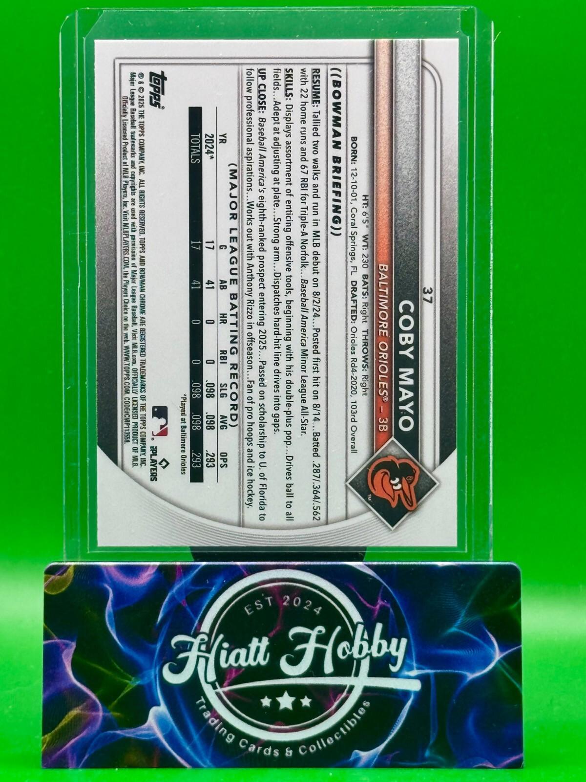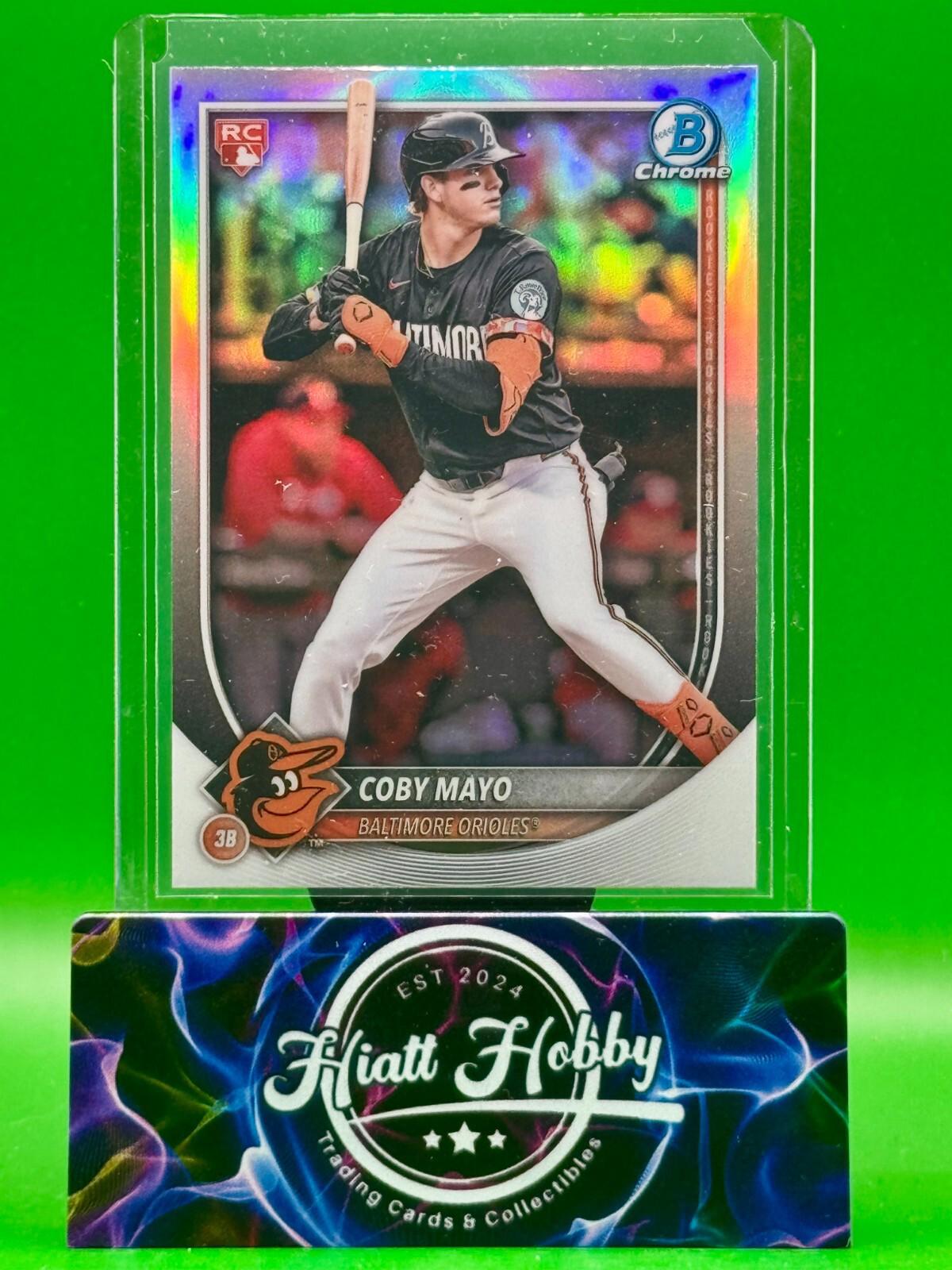 The 2025 Bowman Chrome Coby Mayo #37 Red Rookie Redemption trading card is a highly sought-after collectible for Major League Baseball fans. Produced by Topps, this original sports trading card features the rookie player Coby Mayo from the Baltimore Orioles. Made of card stock with a Chrome Refractor parallel variety, this English-language card is part of the Red Rookie Redemption insert set, making it a valuable addition to any baseball card collection. Perfect for fans of the MLB World Series and sports trading cards, this standard-sized card is a must-have for collectors looking for unique and limited edition pieces. Please Read: SHIPPING SCHEDULE We make every attempt to ship your item out quickly.  Our standard shipping schedule is Tuesday, Thursday, and Saturday drops at the post office and we include all items that have been paid for up to 5PM central the day prior.  That is, all purchases that have been paid for by 5PM central on a Monday will be included in the Tuesday shipment.  If the payment is received after the 5PM deadline, it will be part of the Thursday order drop. SHIPPING DETAILS Cards and Magazines are shipped out in padded or rigid envelopes and/or inserts to protect the item.  Individual cards are typically are shipped in a semi rigid card protector and a penny sleeve.  Combined orders will be packaged securely, but may not have a semi-rigid card protector (item will still be well protected) . Larger items are boxed up properly. We cannot control the USPS or UPS when it comes to the timely delivery of an item, their methods and handling of the item. Please DO NOT hold us responsible for the efforts of a delivery service, however, if you suspect damage to the package, please take pictures prior to opening and record the opening.  This would help with any insurance claims and reimbursements. We offer eBay Standard Envelope Shipping for orders at or below $20.  If your order exceeds $20, you must select USPS Ground Advantage for shipping in order for the order to be processed. SHIPPING INSURANCE Any Items that exceed $100 will include additional handling charges.  This fee is to cover the cost of insuring the item during transit. INTERNATIONAL SHIPPING We are pleased to now offer international shipping! PICTURES All photos are of the item you are bidding on when bidding on single item listings and will not be swapped out for other versions. Items that have multiple quantities will be in similar or better condition. PICTURES For listings that do not have variations, the card depicted in the photo is the card you will receive.  In cases that the listing has variations, the card may not be the same, but each card is inspected to ensure the same level of condition. MULTIPLE PURCHASES When purchasing multiple item from us, please wait to discuss before paying.  We will combine shipping for you and try to save some money. RATINGS & FEEDBACK If you have an issue with something, please try and contact us first so that we may try and work it out. If we come to a satisfactory conclusion, please consider providing a favorable review and positive feedback. Thank you so much for any business that you do with us.