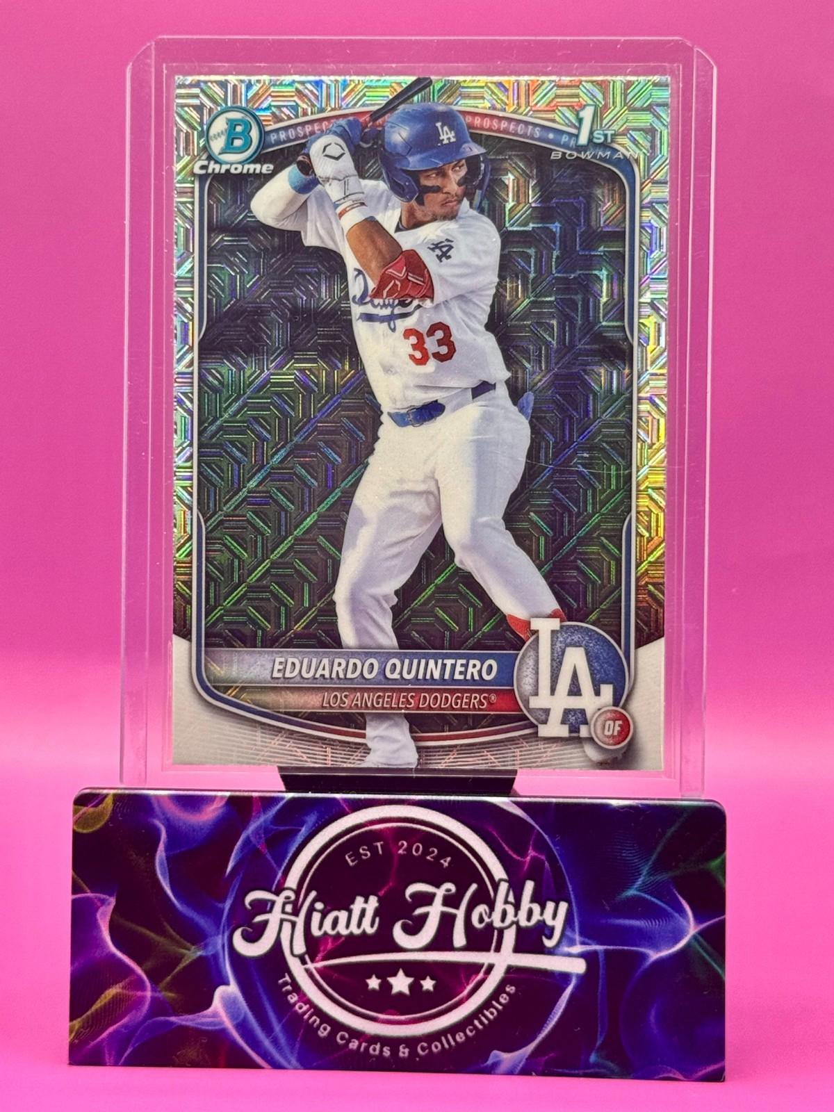 The product is a 2025 Bowman Chrome baseball trading card featuring Eduardo Quintero from the Los Angeles Dodgers. This particular card is a Mojo Refractor parallel, making it a sought-after variety for collectors. Produced by Topps, this original card is part of the Chrome Prospects insert set and showcases Quintero as a rookie player in Major League Baseball. With a standard size and in English language, this collectible is a valuable addition to any baseball card collection.