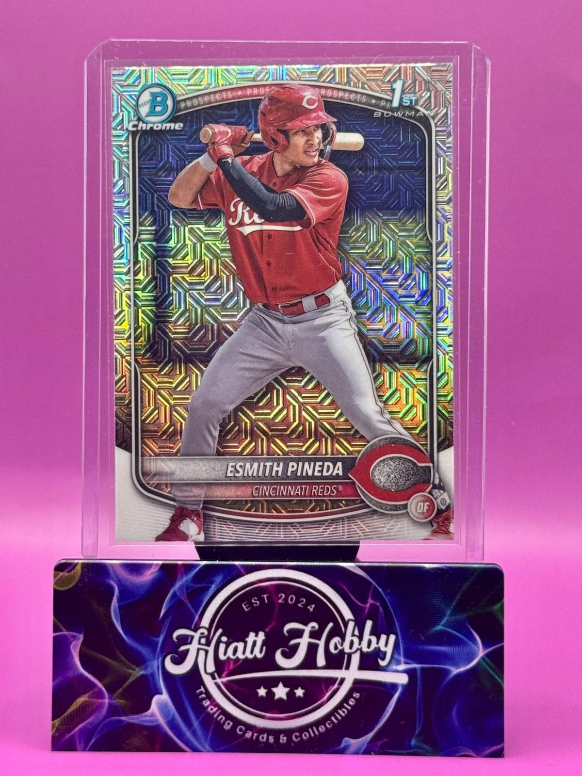 The product is a 2025 Bowman Chrome baseball trading card featuring Esmith Pineda of the Cincinnati Reds. This Mojo Refractor card is part of the Chrome Prospects insert set and is an original release by Topps. It is a standard-sized card in English language, manufactured in the United States. It is a collectible item for fans of Major League Baseball, specifically the MLB World Series tournament.