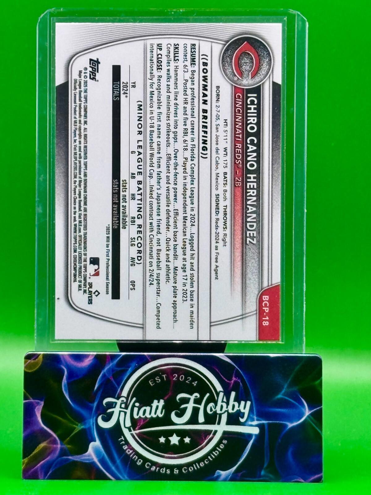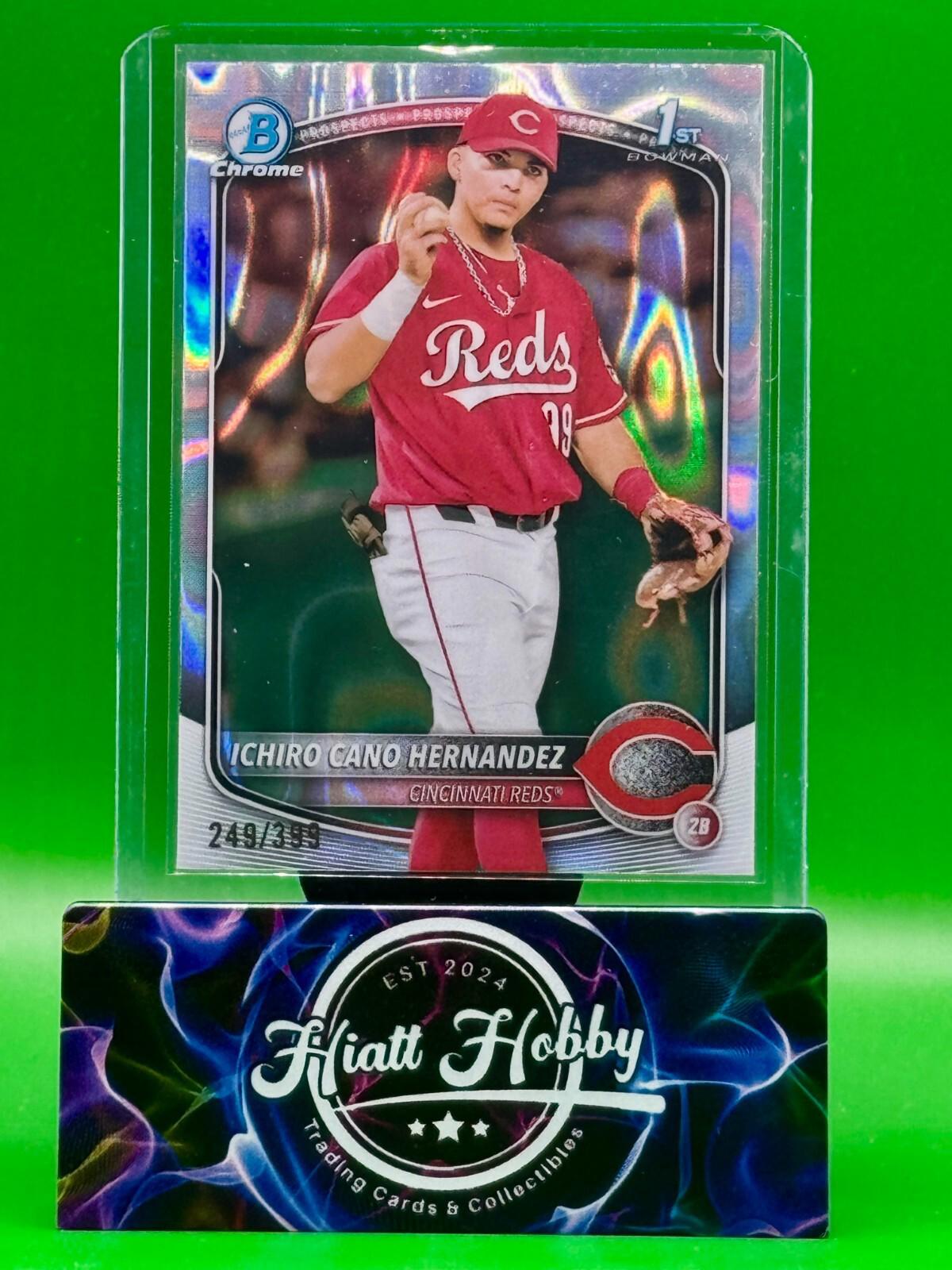 Capture a piece of baseball history with the 2025 Bowman Chrome Ichiro Cano Hernandez card #BCP-18, a sought-after Lava Refractor with a limited print run of just 399. This rookie card showcases the promise of Cincinnati Reds' star Ichiro Cano Hernandez, commemorating his impact in the Major League Baseball world.Crafted by the reputable Topps manufacturer, this card is a treasure for collectors and fans alike, featuring the standard card size and English language. As an original print, it's a genuine piece of sports memorabilia from the United States, unautographed and presented in its pristine form, ready to be a standout in any collection.