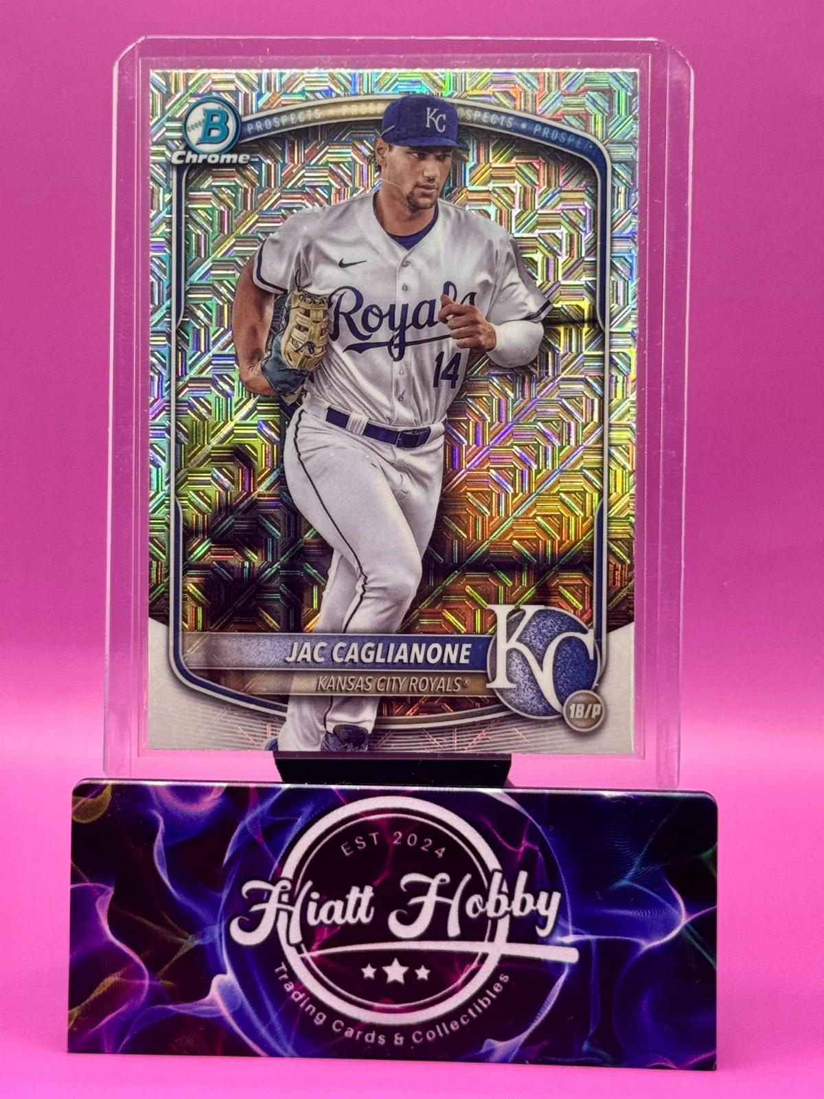 The product is a 2025 Bowman Chrome baseball trading card featuring Jac Caglianone from the Kansas City Royals. This original card is part of the Chrome Prospects insert set and has a Mojo Refractor parallel variety. It is a standard-sized card in English language manufactured by Topps in the United States. This sports trading card is not autographed and does not belong to a vintage set, making it a valuable addition for collectors interested in MLB World Series events and rookie players.