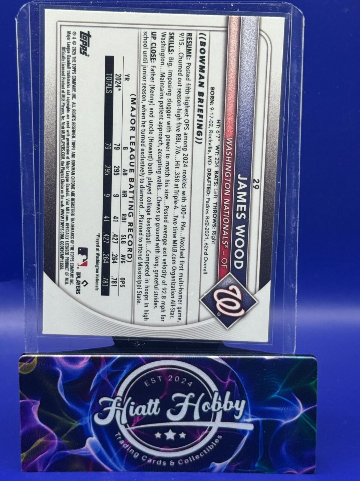 The 2025 Bowman Chrome James Wood #29 Red RC Redemption is a baseball sports trading card featuring the rookie player from the Washington Nationals. This original card manufactured by Topps is part of the 2025 Bowman Chrome set, with a chrome refractor parallel variety. The card is standard-sized and made of card stock, making it a valuable collectible for fans of Major League Baseball and baseball card collectors alike.