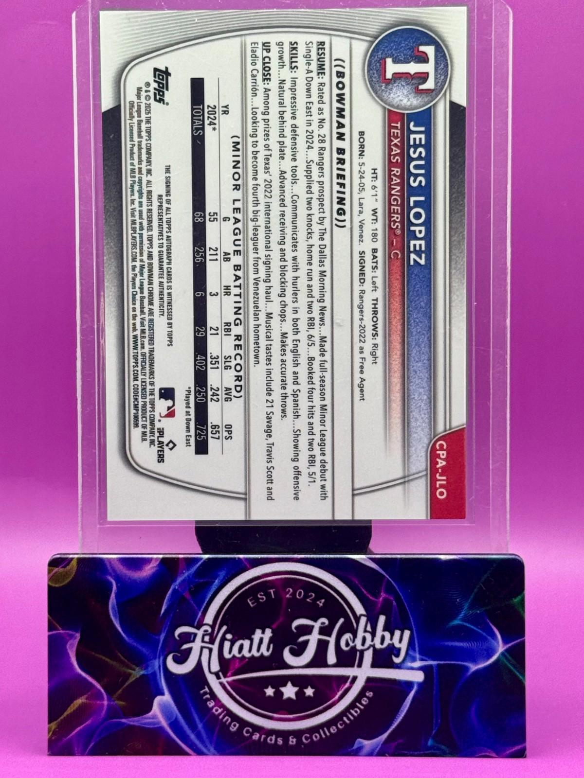 The product is a 2025 Bowman Chrome baseball trading card featuring an autograph from Jesus Lopez, signed in hard format. This card is part of the Chrome Prospect Autographs insert set, with an original design. It is a rookie card that is authenticated by Topps and manufactured by Topps in the United States. The card showcases Lopez as a player for the Texas Rangers in Major League Baseball, making it a valuable collectible for fans and collectors.