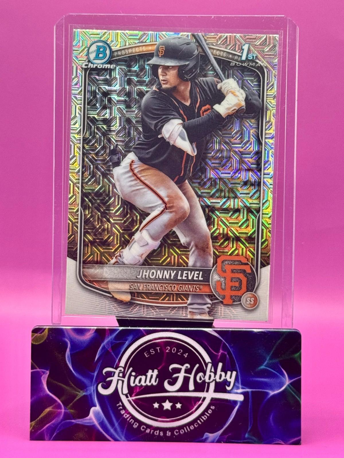 The product is a 2025 Bowman Chrome baseball trading card featuring Jhonny Level of the San Francisco Giants. This card is part of the Chrome Prospects insert set and is a Mojo Refractor parallel variety. Produced by Topps, the card is an original and not a reprint, and is in English. It is a standard-sized card manufactured in the United States for Major League Baseball fans and collectors.