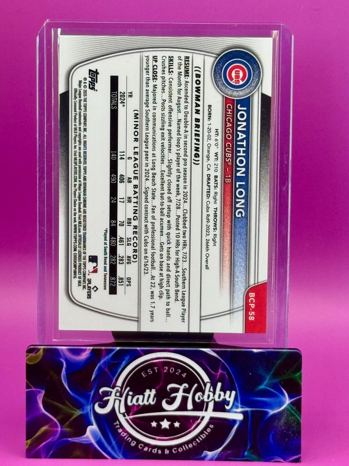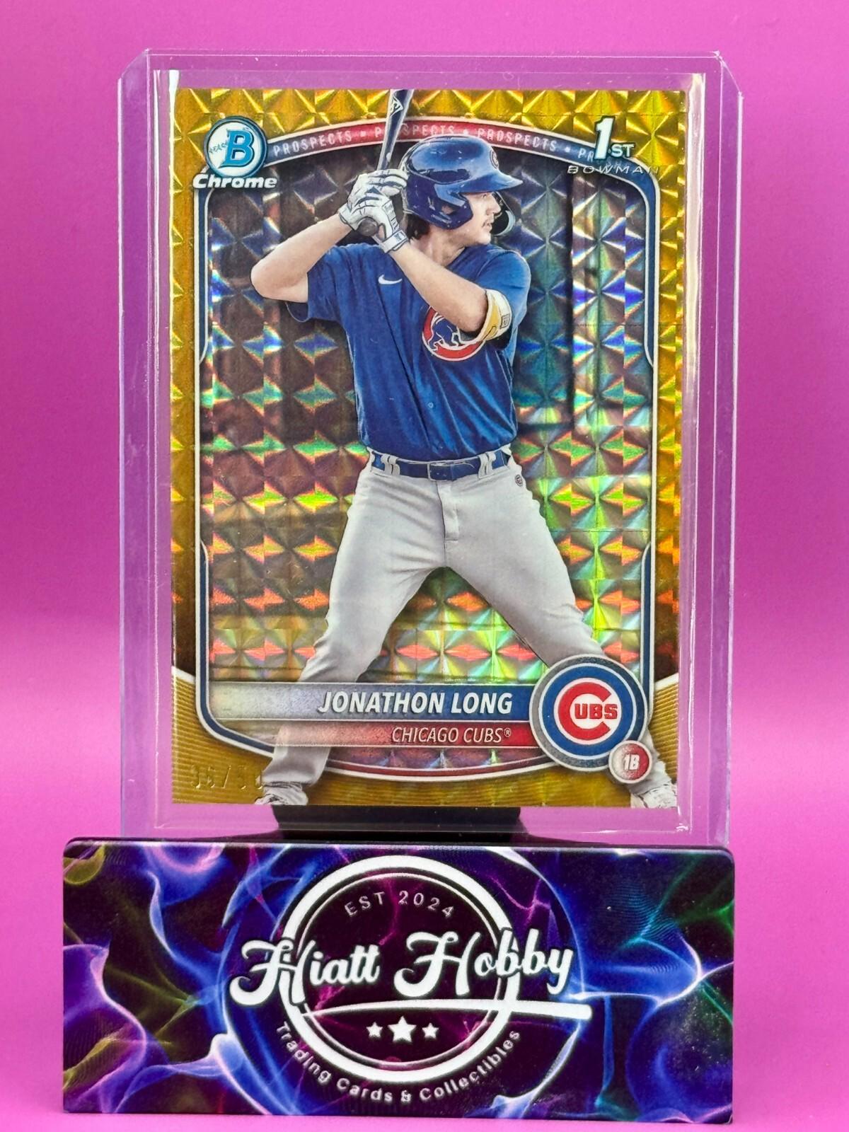 The 2025 Bowman Chrome Jonathon Long #BCP-58 Gold Geometric Refractor is a limited edition sports trading card featuring the Chicago Cubs player. Manufactured by Topps in the United States, this original card is part of the Chrome Prospects insert set with a print run of only 50. The card is made of card stock with a thickness of 35 Pt. and is serial numbered for authenticity. This highly collectible item is a must-have for any baseball card enthusiast looking to add a rare and unique piece to their collection.