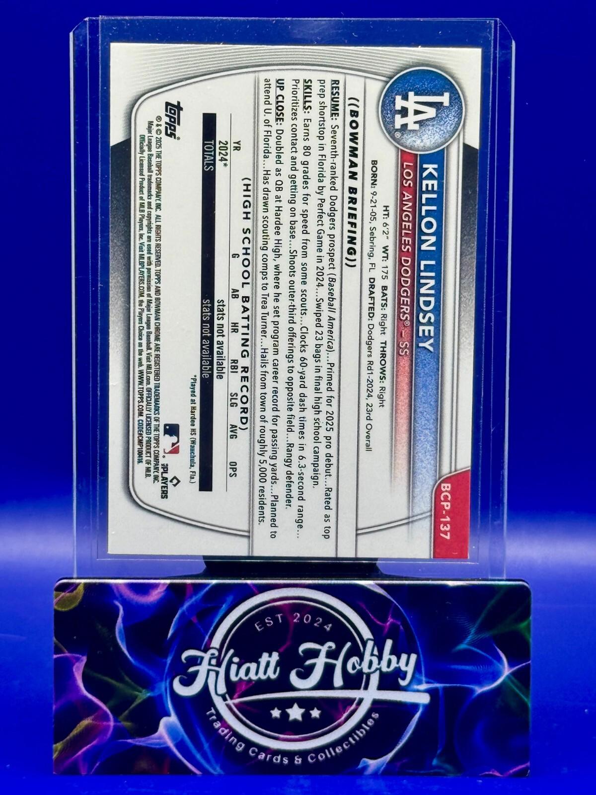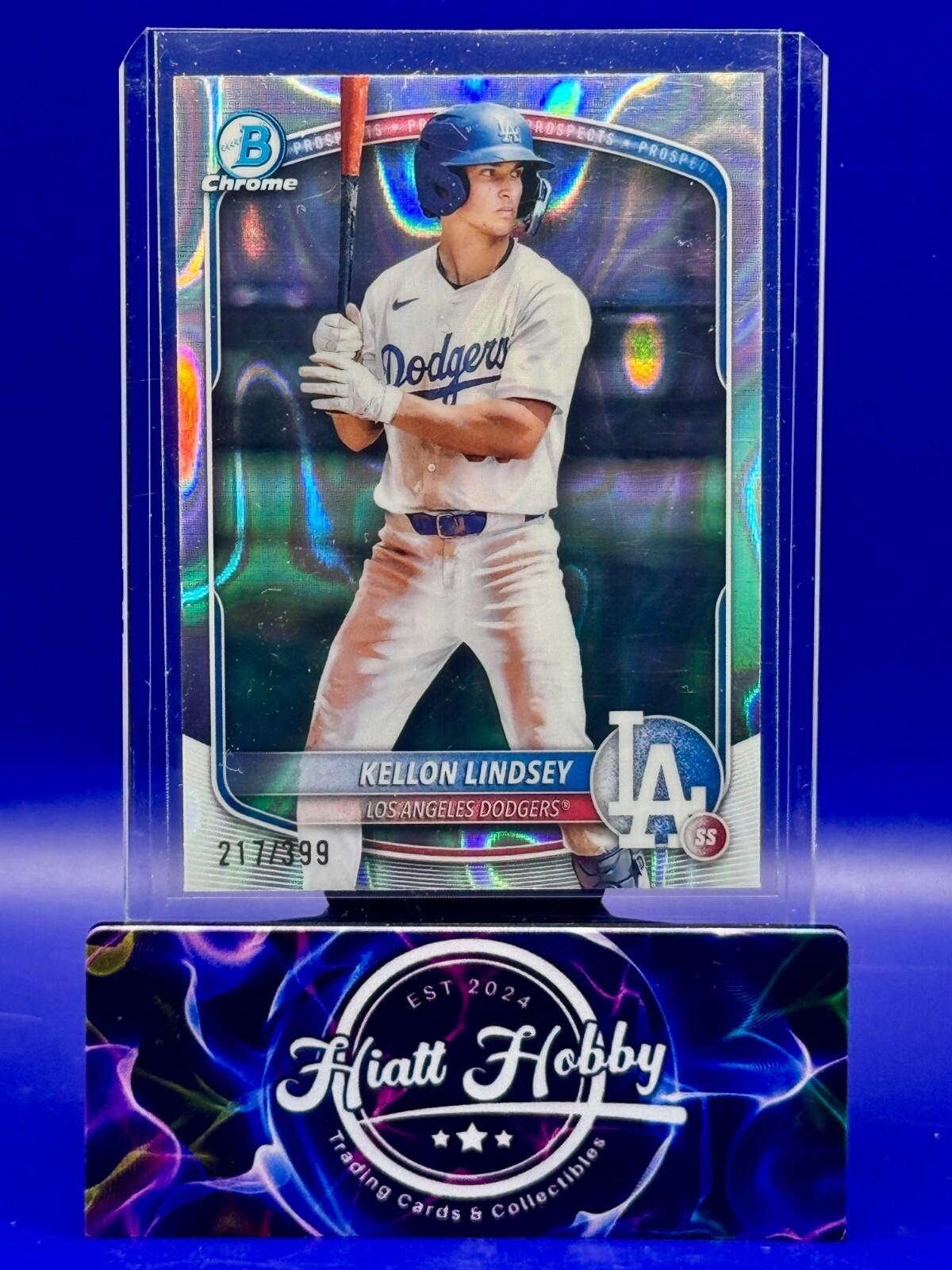 The 2025 Bowman Chrome Kellon Lindsey #BCP-137 Lava Refractor /399 (RC) trading card is a highly sought-after collectible for baseball fans and card collectors alike. This original card features a parallel variety design with a limited print run of only 399 copies, making it a rare find for collectors. Manufactured by Topps, this card showcases the rookie player Kellon Lindsey from the Los Angeles Dodgers, part of the MLB World Series event/tournament. With its unique design and serial numbering, this English-language card is a prized addition to any sports trading card collection.