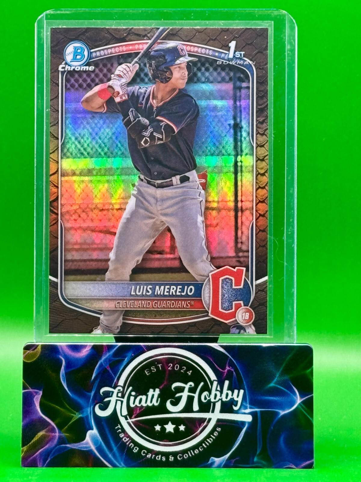 This 2025 Bowman Chrome sports trading card features Luis Merejo of the Cleveland Guardians in the Major League (MLB). The card is an original, licensed reprint and is part of the Reptillian Refractor parallel/variety. It is a rookie card with a print run of BCP-140 and is in English. The card is from the 2025 Bowman Chrome set and is graded as Near Mint or Better. It is a standard-sized card that was manufactured in the United States by Topps. The card is perfect for any baseball fan or collector looking to add to their collection.