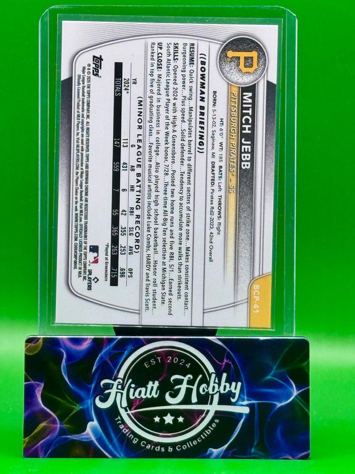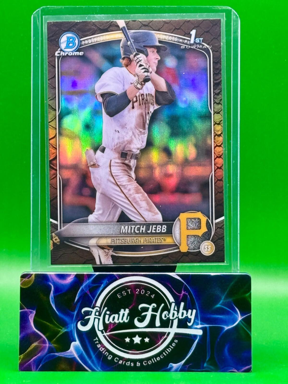 Elevate your collection with the 2025 Bowman Chrome Mitch Jebb #BCP-41 card, featuring the Reptillian Refractor parallel. A standout addition for any baseball enthusiast, this card showcases the promising talent of Mitch Jebb with the Pittsburgh Pirates. The card is a testament to Jebb's rookie season, capturing the excitement of the MLB World Series event.Crafted by Topps, a trusted name in sports trading cards, this original piece is presented in English and originates from the United States. With its standard card size, this item fits seamlessly into any collection. The card is not autographed, allowing Jebb's dynamic presence on the field to be the focal point. Add a piece of baseball history to your collection today.