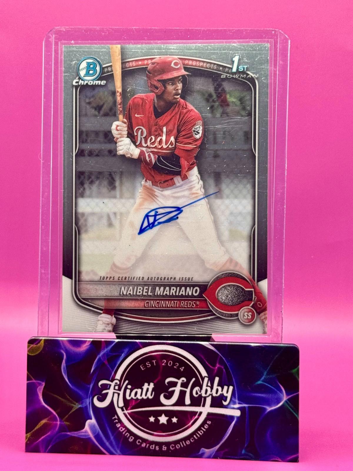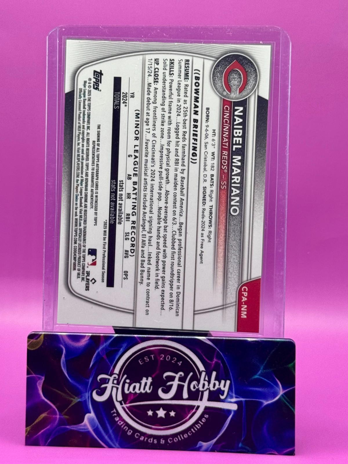 The 2025 Bowman - Chrome Prospect Autographs Naibel Mariano #CPA-NM is a highly sought-after baseball trading card featuring an autograph from Naibel Mariano, a player from the Cincinnati Reds. This rookie card is part of the 2025 Bowman set manufactured by Topps, known for its high-quality original cards in English. Authenticated by Topps, this hard-signed autograph adds value to this collectible item, making it a desirable addition to any baseball card collection.