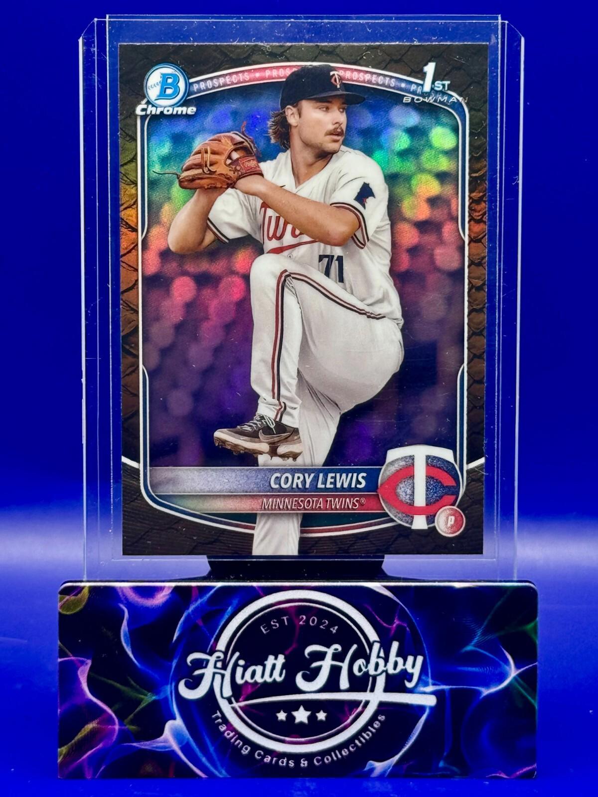 The product is a 2025 Bowman Chrome baseball trading card featuring Cory Lewis of the Minnesota Twins. This particular card is a Reptilian Refractor parallel, making it a unique and attractive addition to any sports card collection. Manufactured by Topps in the United States, this original card is from the 2025 season of Major League Baseball and is a must-have for fans and collectors looking to own a piece of MLB history.