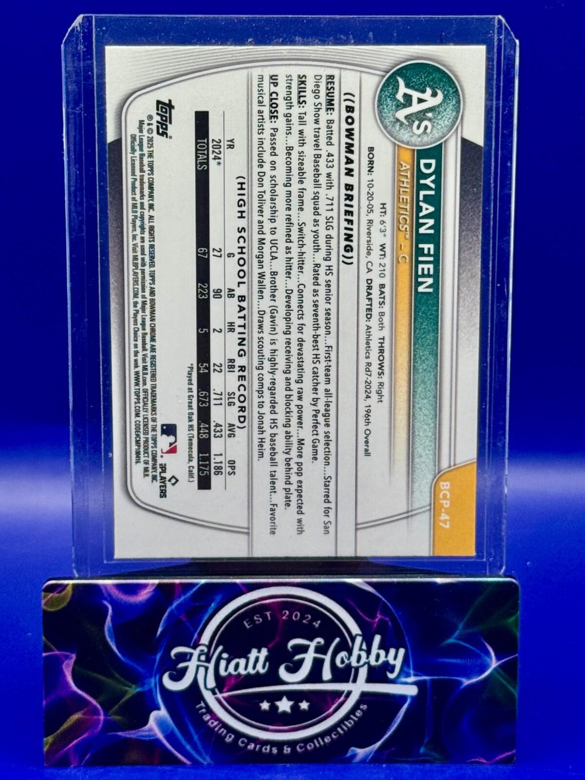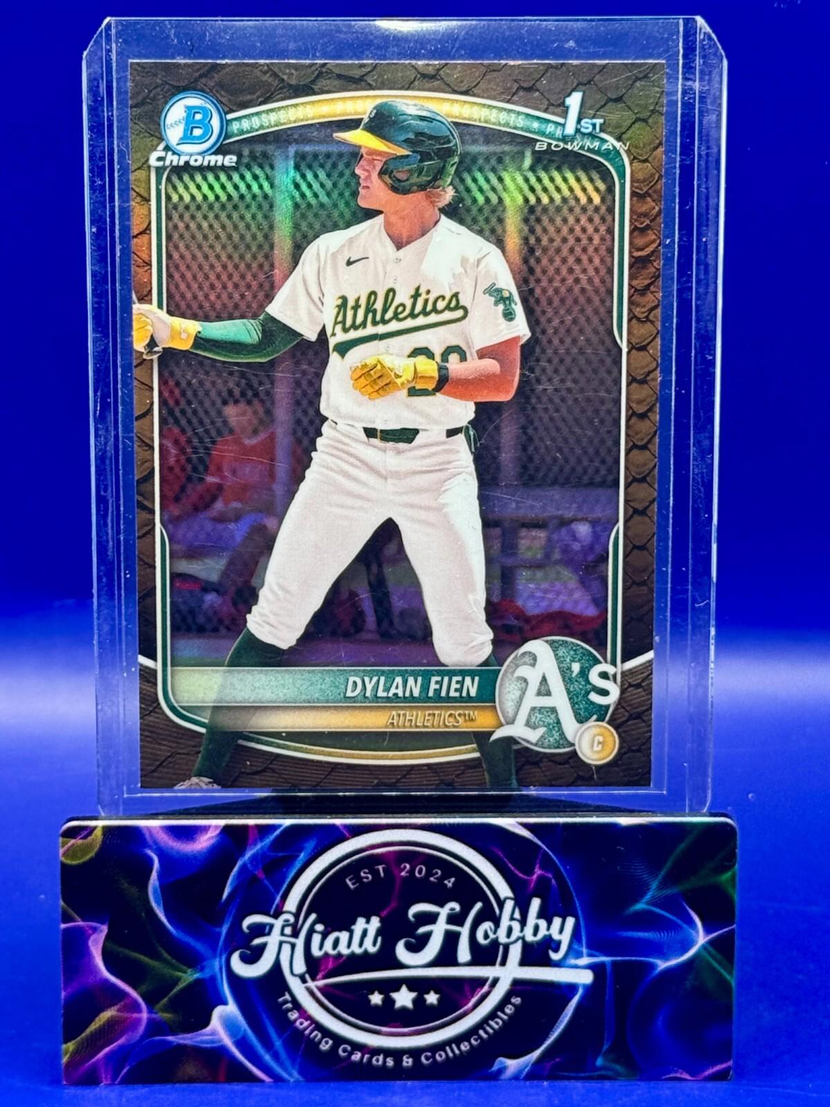 The 2025 Bowman Chrome Prospects Dylan Fien #BCP-47 Reptillian Refractor (RC) trading card is a highly sought-after collectible item for MLB baseball fans and card enthusiasts. Manufactured by Topps in 2025, this original card features Dylan Fien of the Oakland Athletics in a unique Reptilian Refractor parallel variety. Made of card stock and part of the MLB World Series event, this English-language sports trading card is a must-have for fans of baseball rookies and limited edition card collectors.