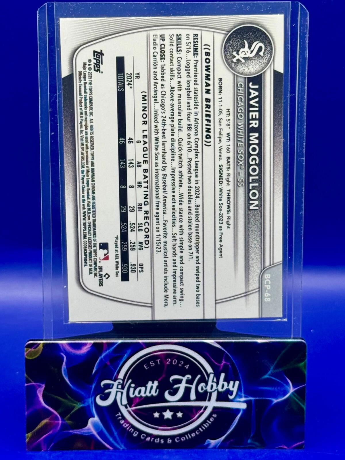 The product is a 2025 Bowman Chrome sports trading card featuring Javier Mogollon, a player from the Chicago White Sox. This card is part of the MLB World Series set and is a Reptilian Refractor parallel variety, making it a unique addition to any baseball card collection. Manufactured by Topps, this original card showcases Mogollon as a rookie player in the Major League Baseball (MLB) league. The card is in English and follows the standard size for sports trading cards in the United States.
