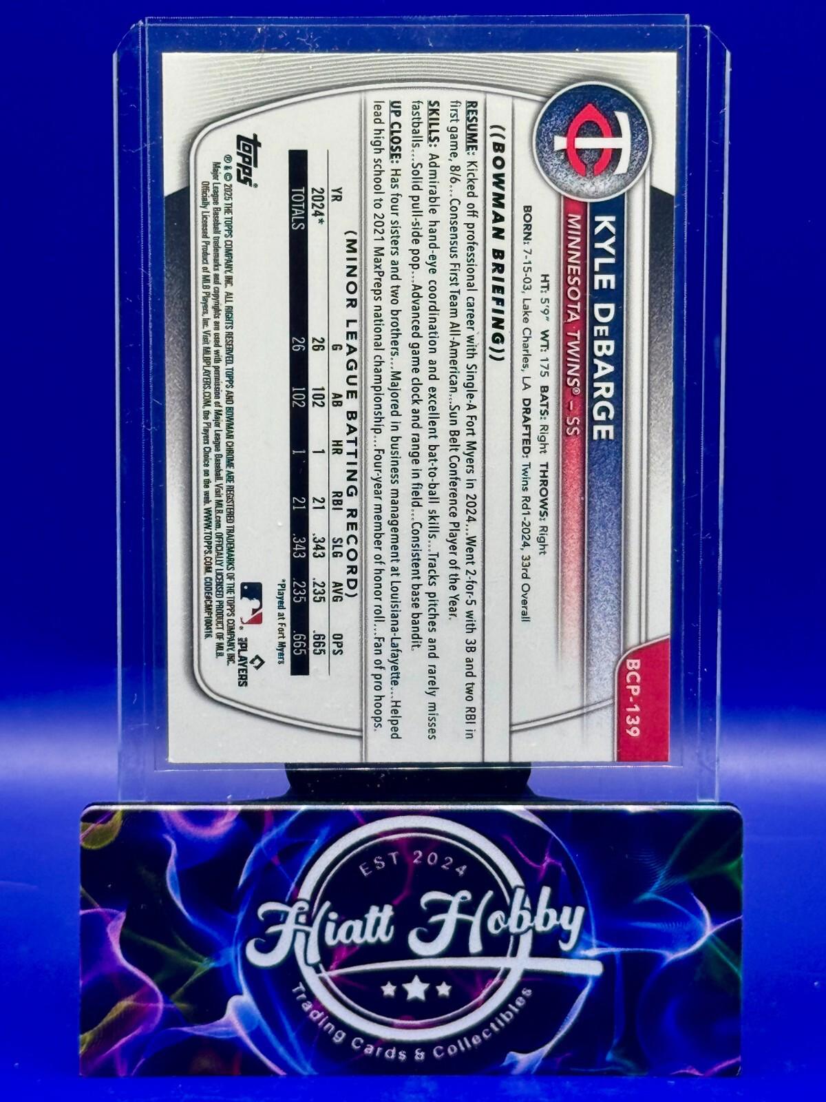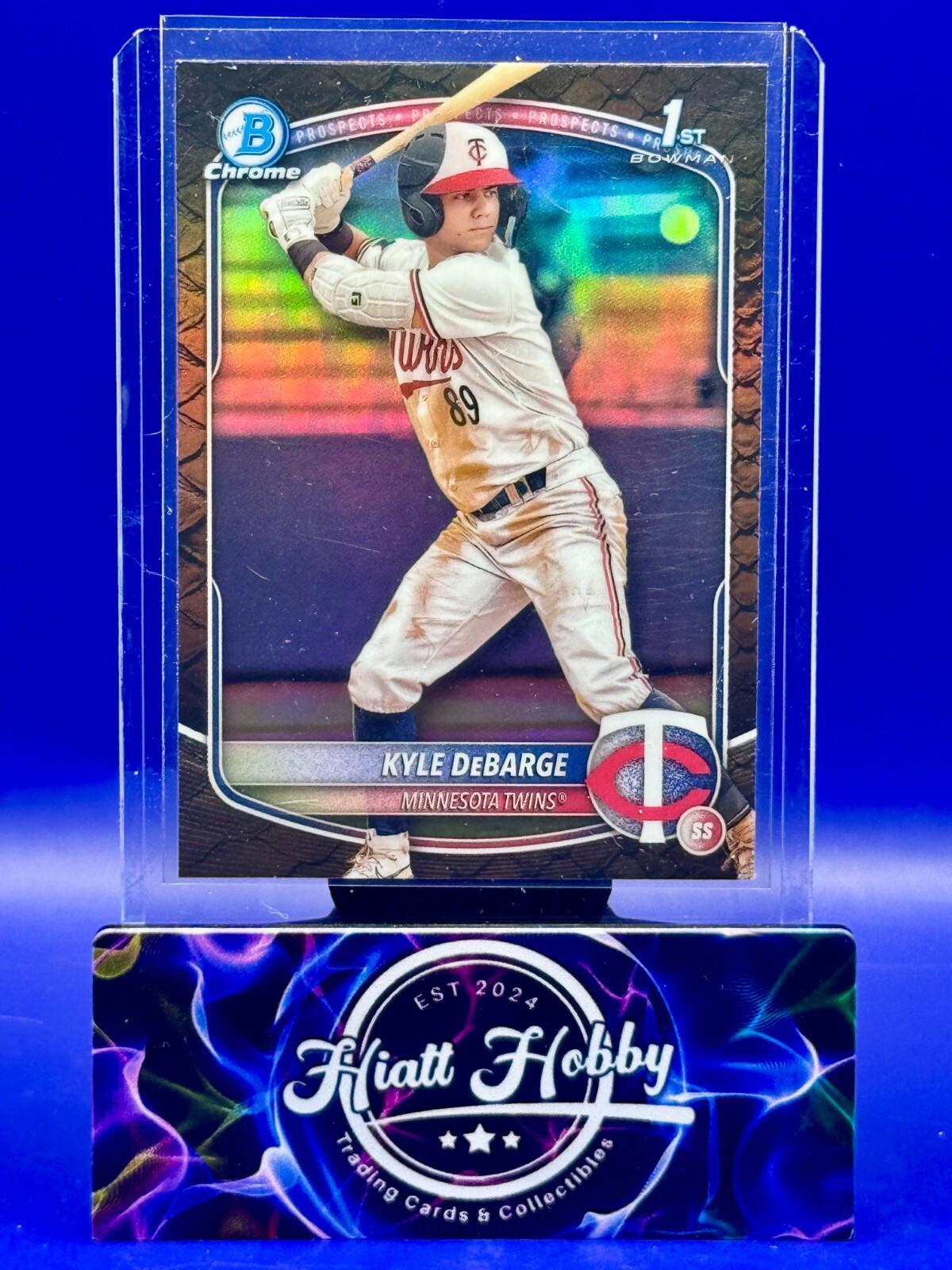 The 2025 Bowman Chrome Prospects Kyle DeBarge #BCP-139 Reptilian Refractor (RC) is a highly sought after baseball trading card featuring Kyle DeBarge of the Minnesota Twins. This original card from Topps is a part of the Major League (MLB) league in the 2025 season, making it a valuable addition to any baseball card collection. The Reptilian Refractor parallel variety adds uniqueness to this standard-sized card, making it a standout piece for collectors looking for rookie cards of up-and-coming players in the sport of baseball.