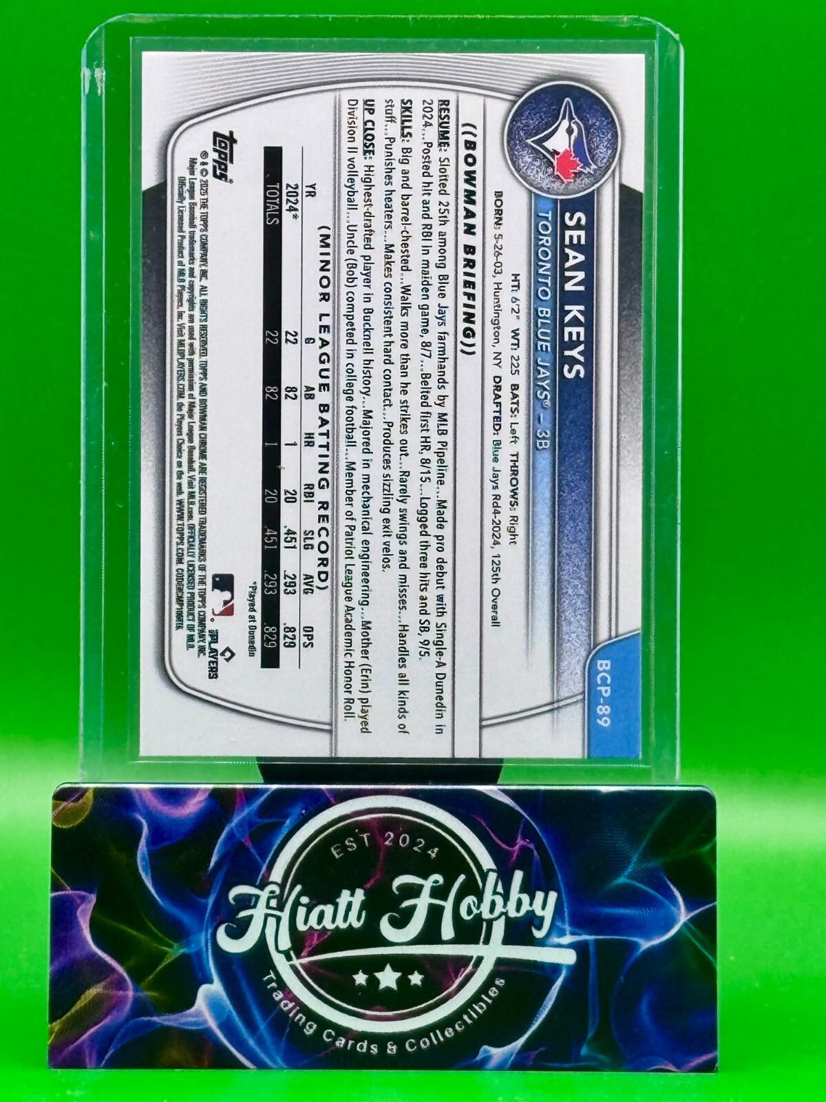 This 2025 Bowman Chrome sports trading card features Sean Keys of the Toronto Blue Jays in the Major League (MLB). The card is an Original/Licensed Reprint, with a Card Size of Standard and a Card Thickness of 20 Pt. It is part of the Reptillian Refractor Parallel/Variety set, and is a Rookie card with the card number BCP-89. The card is in Near Mint or Better condition, and is an excellent addition to any baseball fan's collection. The card was manufactured by Topps in the United States, and is a great reminder of the MLB World Series event. This card is a must-have for any collector looking to complete their 2025 Bowman Chrome set.
