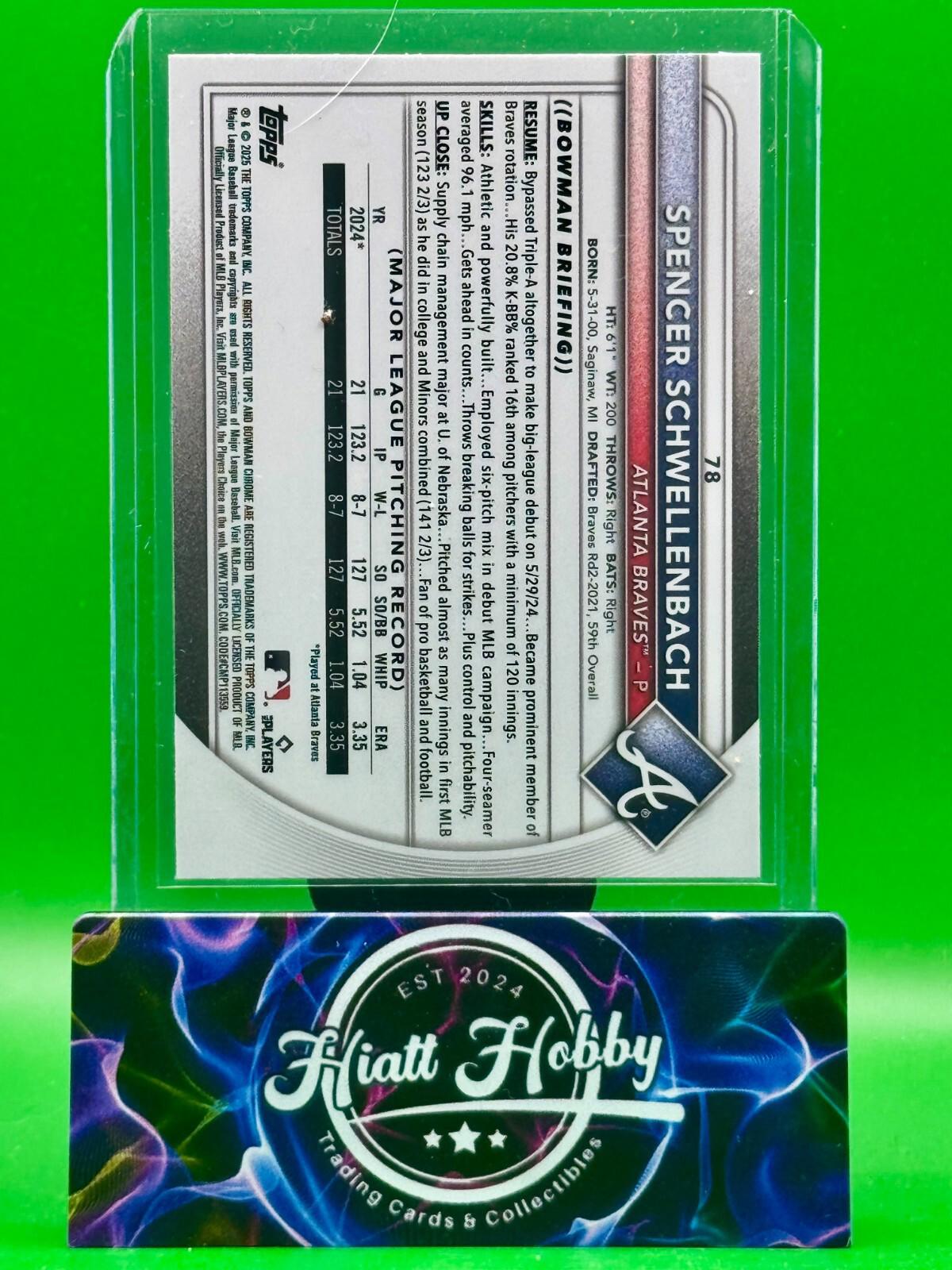 Capture the excitement of the diamond with this 2025 Bowman Chrome Spencer Schwellenbach Red RC Refractor card. Showcasing the Atlanta Braves' promising talent, this card is a vibrant testament to Schwellenbach's rookie year. With its eye-catching chrome finish and the prestige of the Major League Baseball, this collectible is a must-have for enthusiasts and fans.Strategically crafted by Topps, the card #78 from the 2025 set is a celebration of the MLB World Series season. As an original, non-autographed piece, it's a genuine slice of baseball history. The card's standard size and English language make it a familiar addition to any collection, while its Red Rookie Redemption feature marks it as a standout piece.