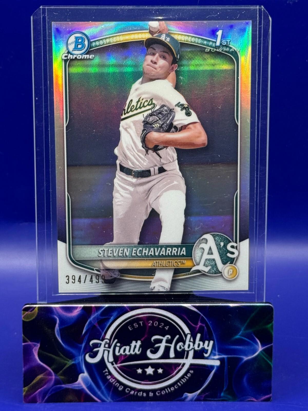 The 2025 Bowman Chrome Steven Echavarria #BCP-73 Refractor /499 (RC) trading card is a sought-after collectible for baseball fans and card collectors. This rookie card features a Chrome Refractor parallel variety that adds a shiny and reflective look to the standard-sized card. Produced by Topps in the United States, this MLB World Series-themed card is part of the Chrome Prospects insert set and is serial numbered for authenticity. With its limited print run of 499, this original card is a valuable addition to any sports trading card collection.