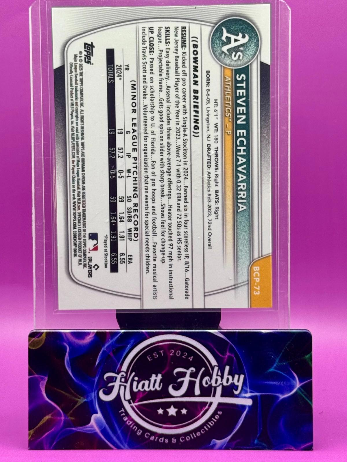 The product is a 2025 Bowman Chrome baseball trading card featuring Steven Echavarria of the Oakland Athletics. This card is a Yellow Refractor parallel, numbered out of 75, and part of the Chrome Prospects insert set. Manufactured by Topps in the United States, the card is made of card stock and is an original release for the 2025 season of Major League Baseball. It does not feature an autograph but is designated as a rookie card, making it a sought-after collectible for fans and collectors alike.