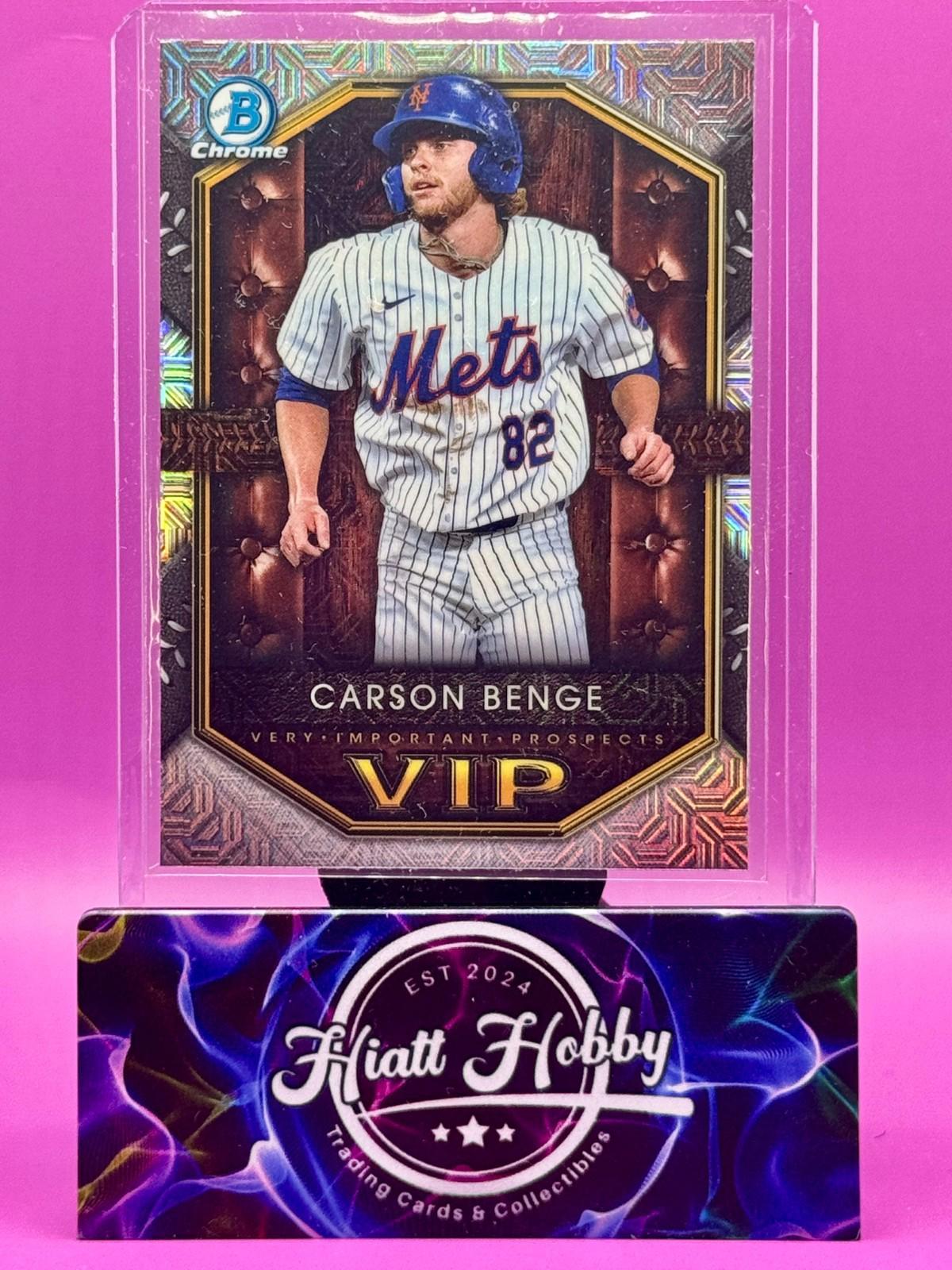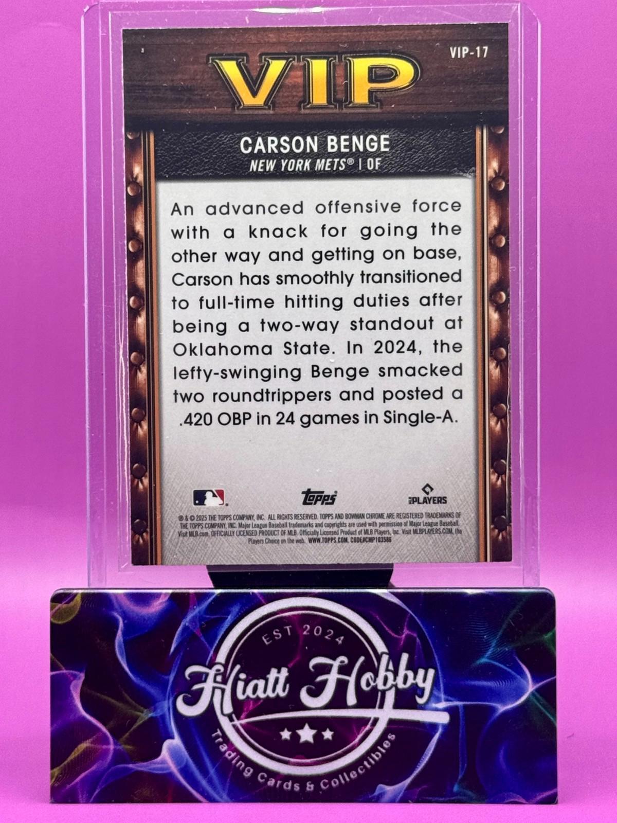 The 2025 Bowman Chrome Very Important Prospects Carson Benge #VIP-17 Mojo (RC) trading card is a highly sought-after collectible item for baseball fans and card collectors. Produced by Topps, this original card features Carson Benge, a promising player from the New York Mets, as part of the MLB World Series event. The Mojo Refractor parallel variety adds a unique shine to the card, making it a standout piece in any collection. Its serial numbering, rookie designation, and insert status make it a valuable addition to any sports trading card collection.