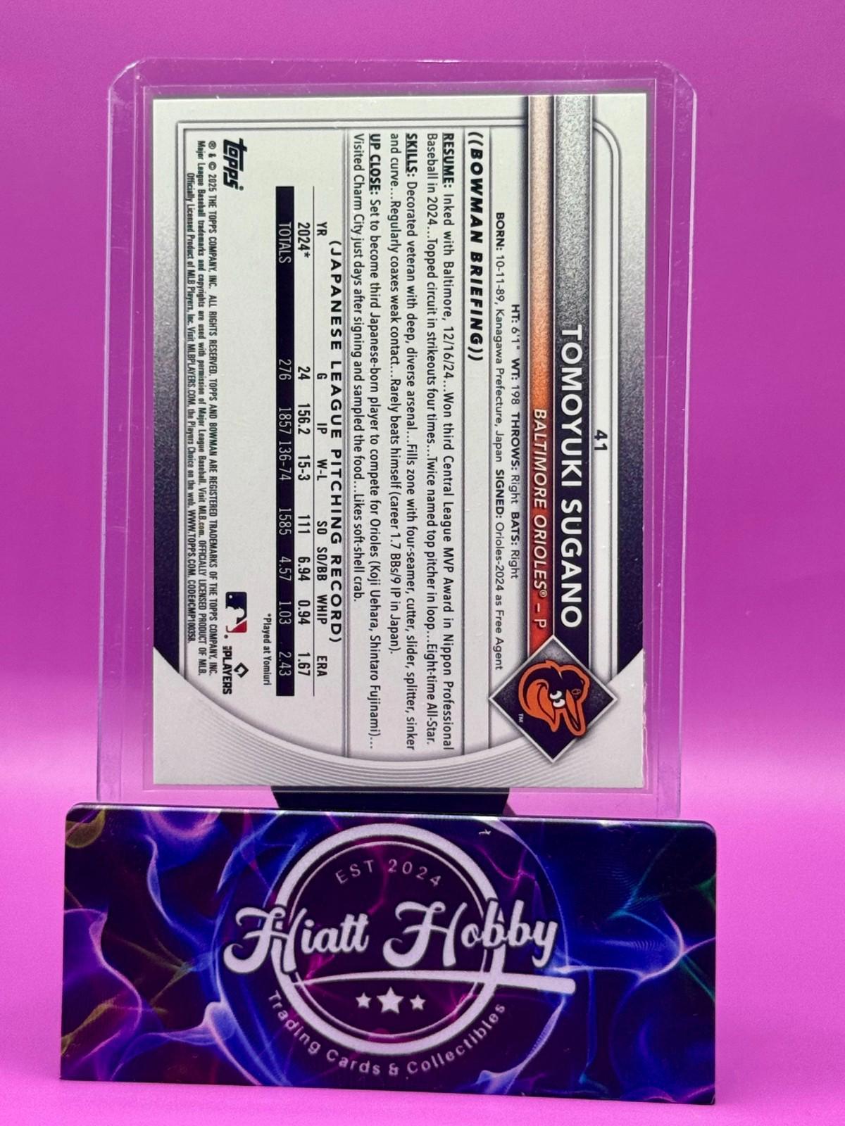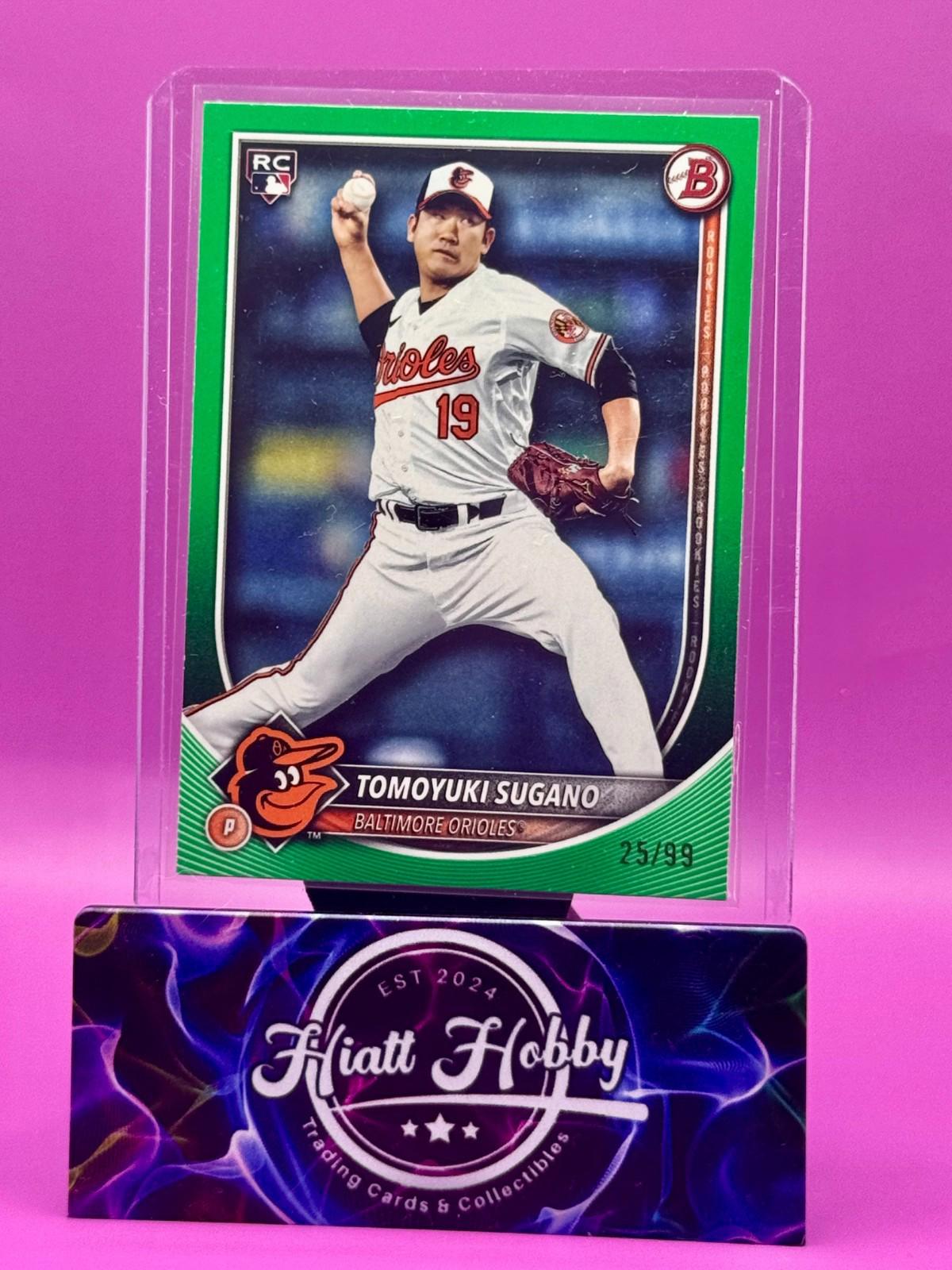 The 2025 Bowman Tomoyuki Sugano #41 Green Border trading card is a limited edition collectible featuring the rookie player from the Baltimore Orioles. This original card manufactured by Topps is part of the 2025 Bowman set and has a print run of only 99, making it a highly sought-after item for baseball card collectors. The card is in English and includes features like serial numbering and a parallel variety, adding to its value and appeal to fans of the sport.
