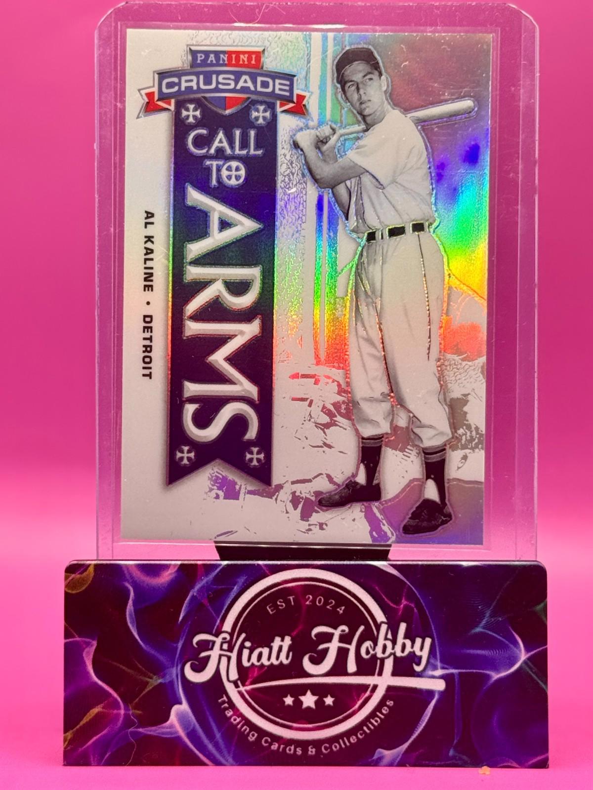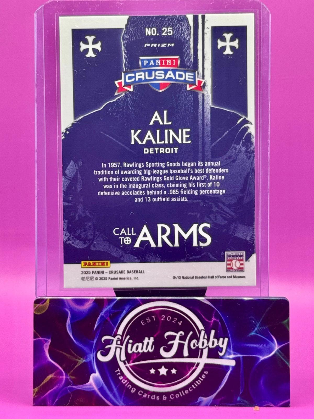 The 2025 Panini Crusade Al Kaline #25 trading card features the legendary Detroit Tigers player in the Call to Arms insert set. This Silver Prizm parallel variety card is made of durable card stock with a thickness of 35 Pt. It showcases Al Kaline in his MLB World Series action, making it a must-have for any baseball card collector.