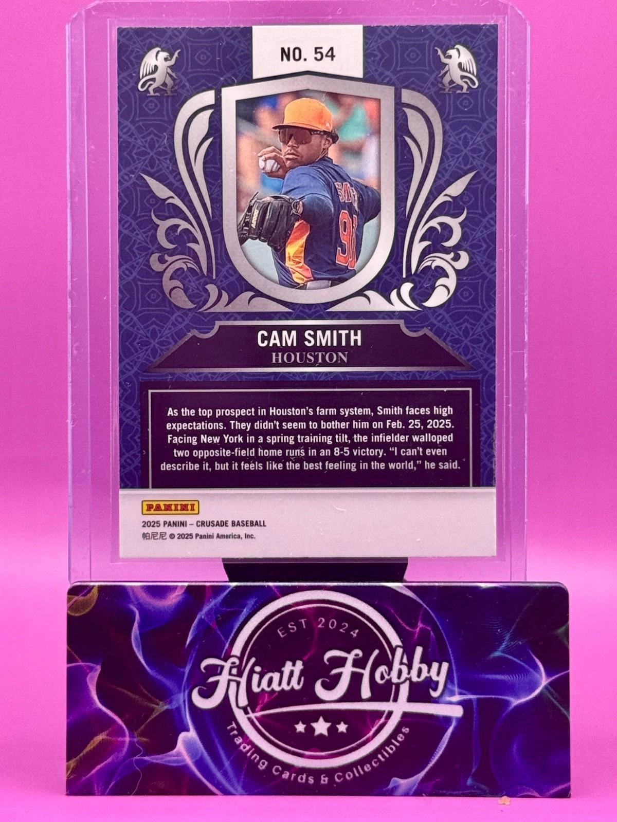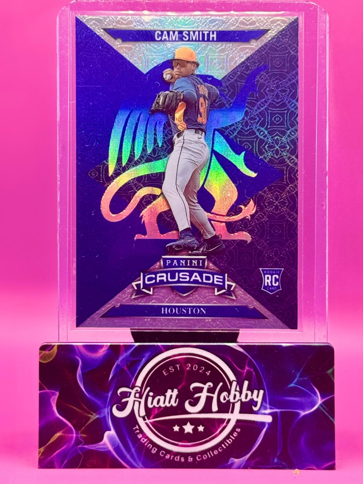 The 2025 Panini Crusade Cam Smith #54 Blue Crusade (RC) trading card is a Major League Baseball collectible featuring the talented athlete from the Houston Astros. Manufactured by Panini, this standard-sized sports trading card is made of card stock material and is part of the original Blue Crusade insert set. This rookie card is a valuable addition to any baseball card collection, especially for fans of the MLB World Series and English language sports memorabilia.