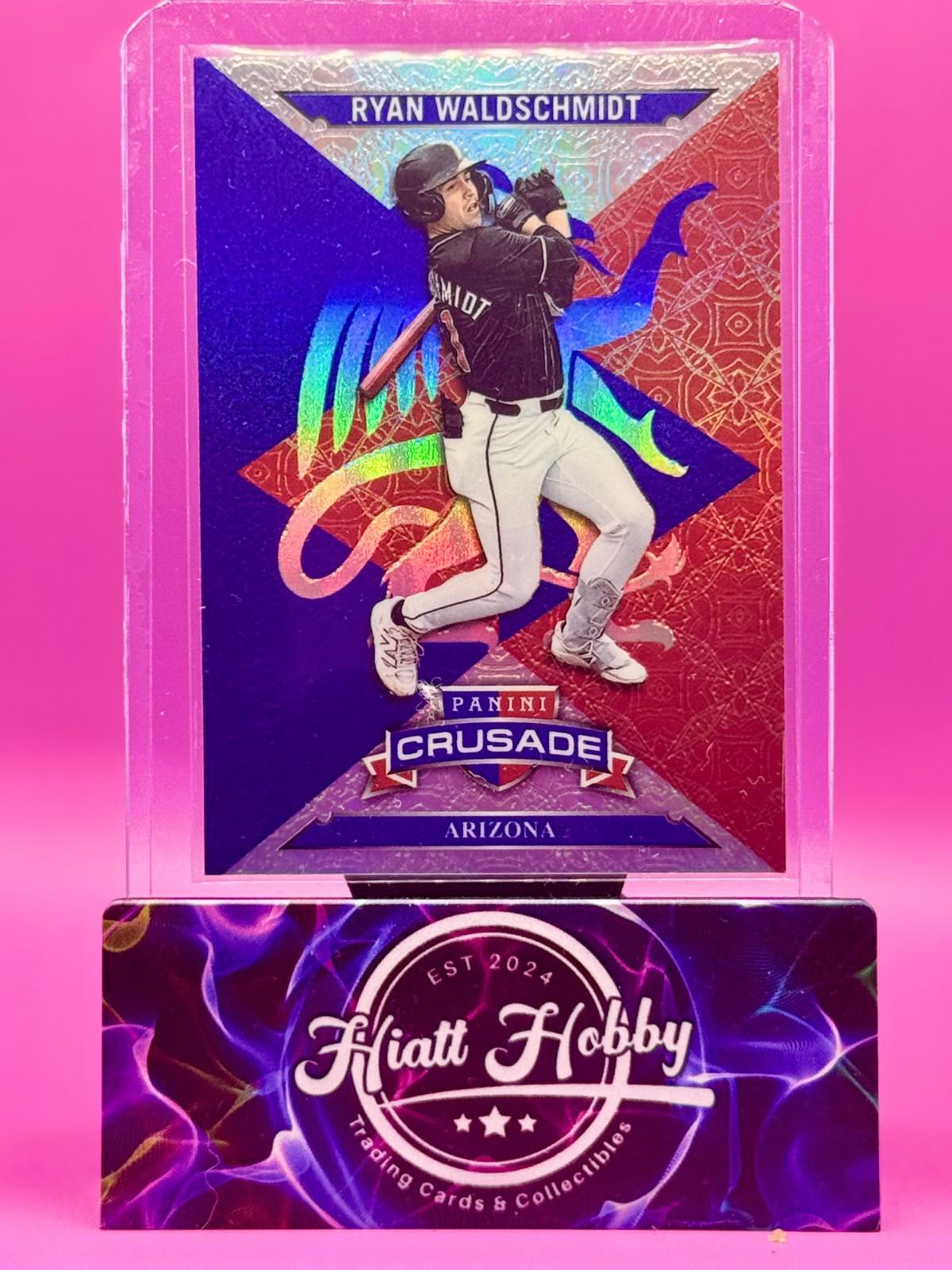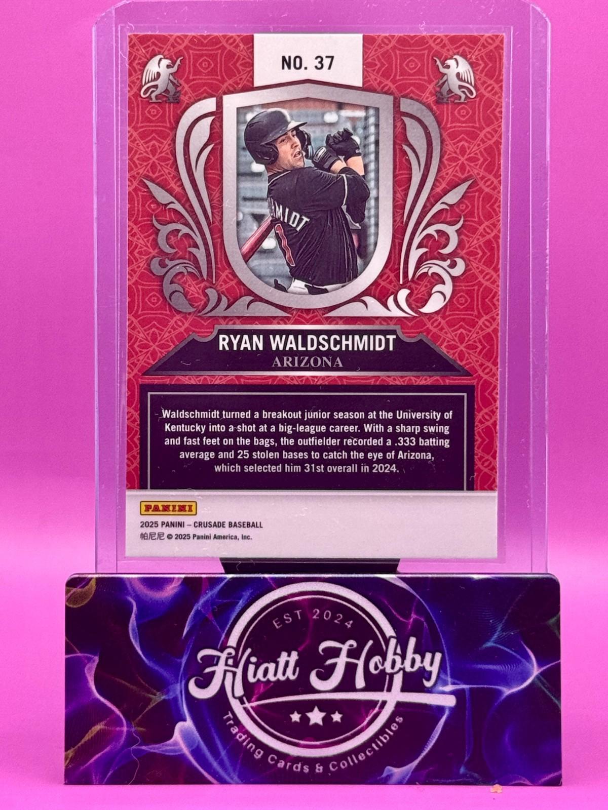The 2025 Panini Crusade trading card featuring Ryan Waldschmidt #37 in the Blue Crusade insert set is a standard-sized baseball card made of card stock. This original card is part of the Major League Baseball league and showcases a rookie player from the Arizona Diamondbacks. Manufactured by Panini, the card is in English and has a 35 Pt. thickness, making it a valuable addition to any sports trading card collection.