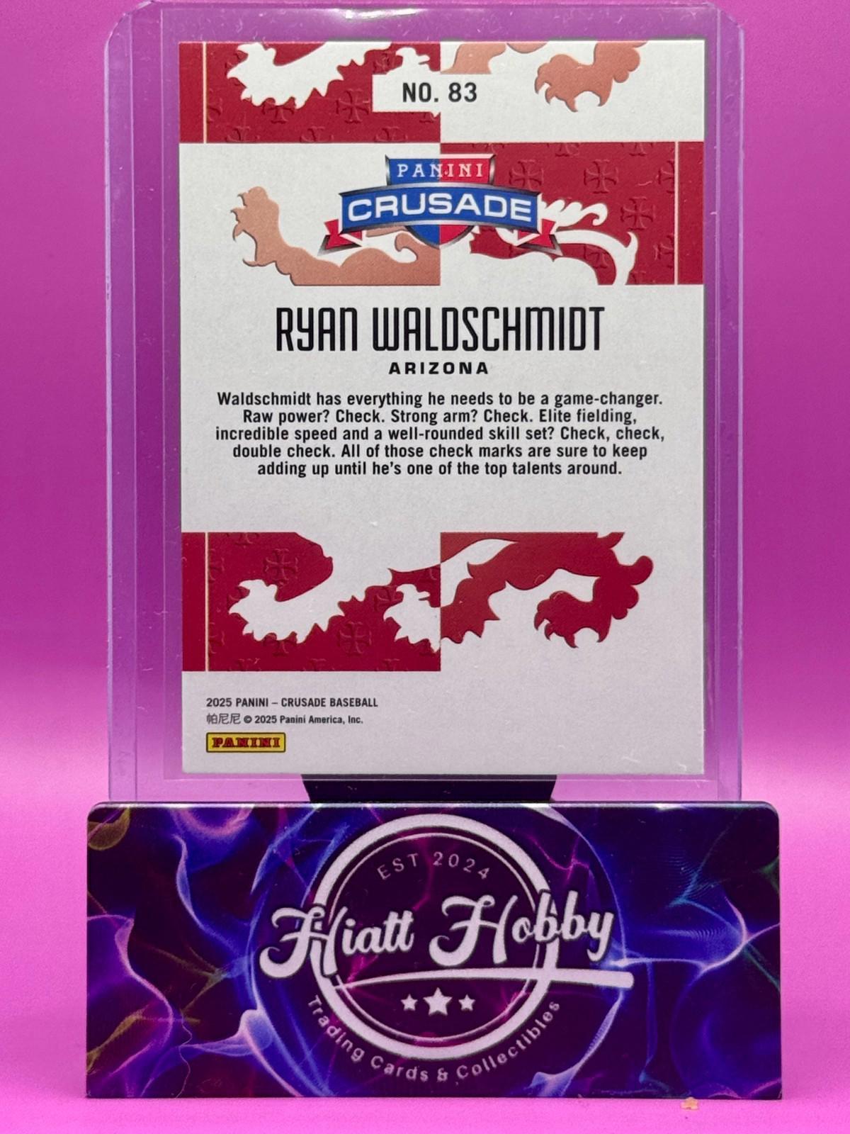 The product is a 2025 Panini Crusade baseball trading card featuring Ryan Waldschmidt from the Arizona Diamondbacks. This card is part of the Silver parallel variety and is considered a Rookie card. Manufactured by Panini in the United States, the standard-size card is made of card stock and is not autographed. It belongs to the Major League (MLB) and is an original, licensed print. The card is a part of the MLB World Series event/tournament and is in English language. With a focus on the 2025 season, this sports trading card is a must-have for any baseball card collector.