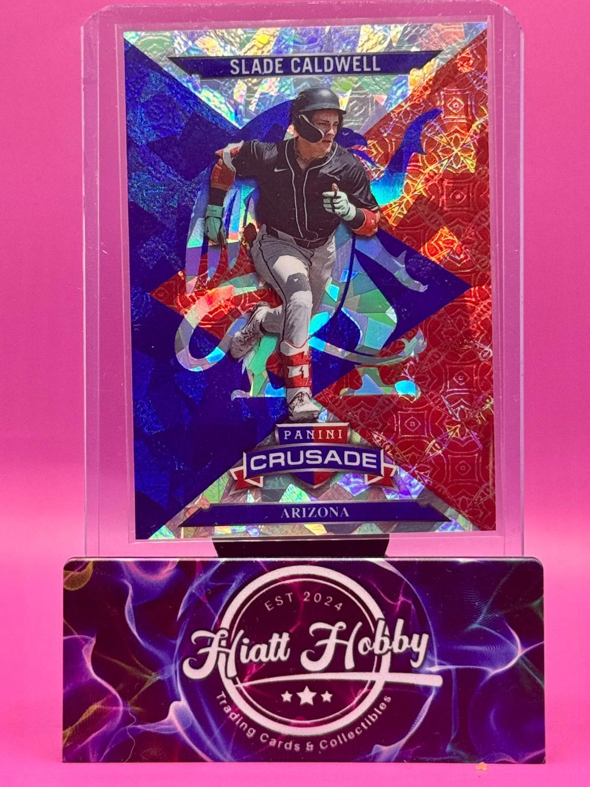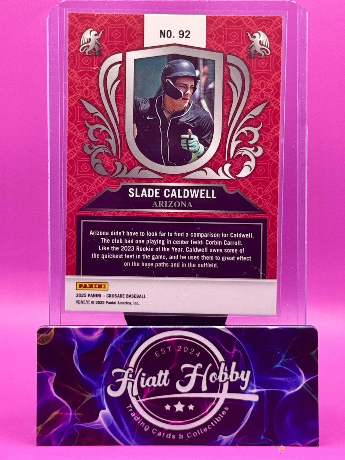 The 2025 Panini Crusade Slade Caldwell #92 Blue Crusade Cracked Ice (RC) trading card is a baseball collectible featuring the player from the Arizona Diamondbacks. This original card is part of the 2025 Panini Crusade set and belongs to the Blue Crusade insert set. The card is a 35 Pt. standard size card made of card stock and includes features like being a rookie card and a parallel/variety. It is a limited edition card with only 15 copies available, making it a sought-after item for collectors and fans of Major League Baseball.