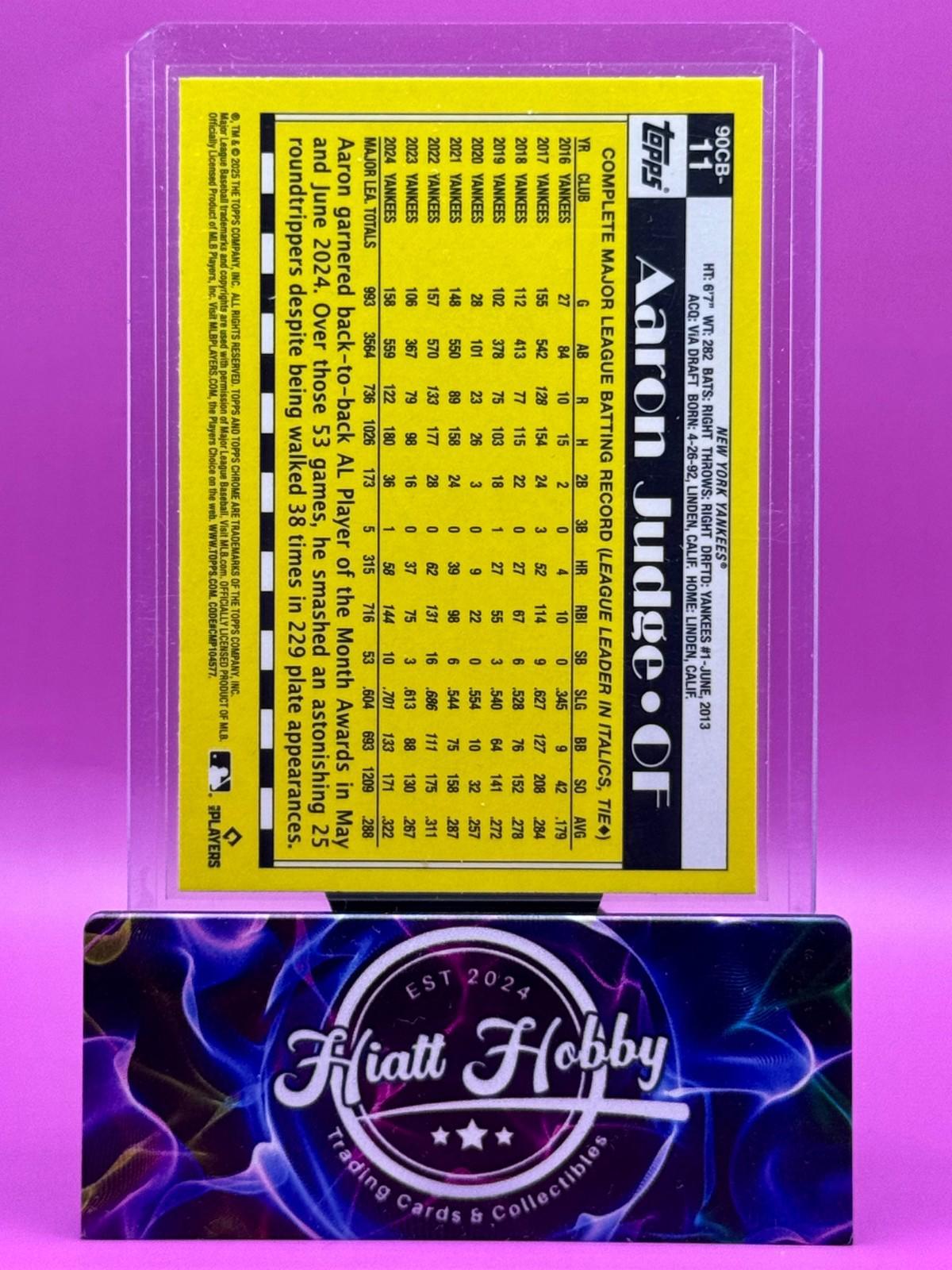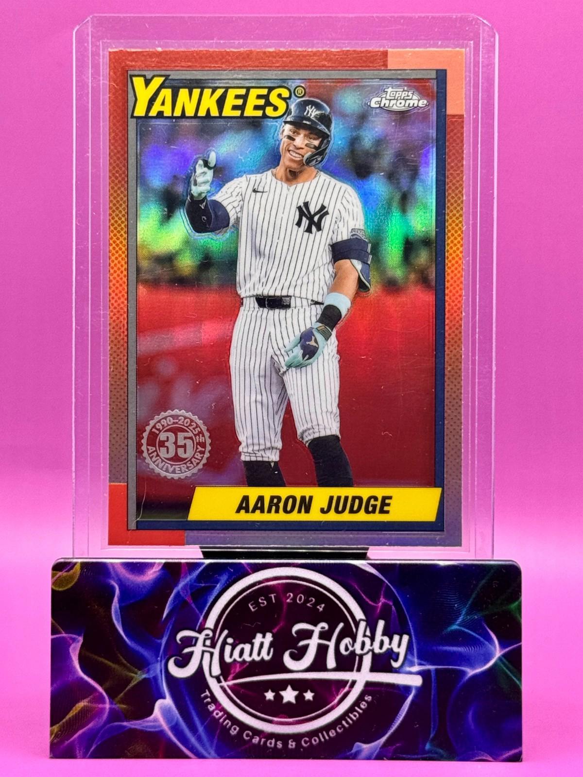 The product is a 2025 Topps Chrome Aaron Judge #90CB-11 sports trading card celebrating the 35th Anniversary of the set. This standard-sized card features the Major League Baseball player Aaron Judge from the New York Yankees, manufactured by Topps in the United States. The card is made of card stock with a thickness of 35 Pt., and includes a refractor parallel/variety design. It is an original release, not a vintage reprint, and commemorates the MLB World Series event/tournament. This collectible item is a must-have for baseball fans and card enthusiasts alike.