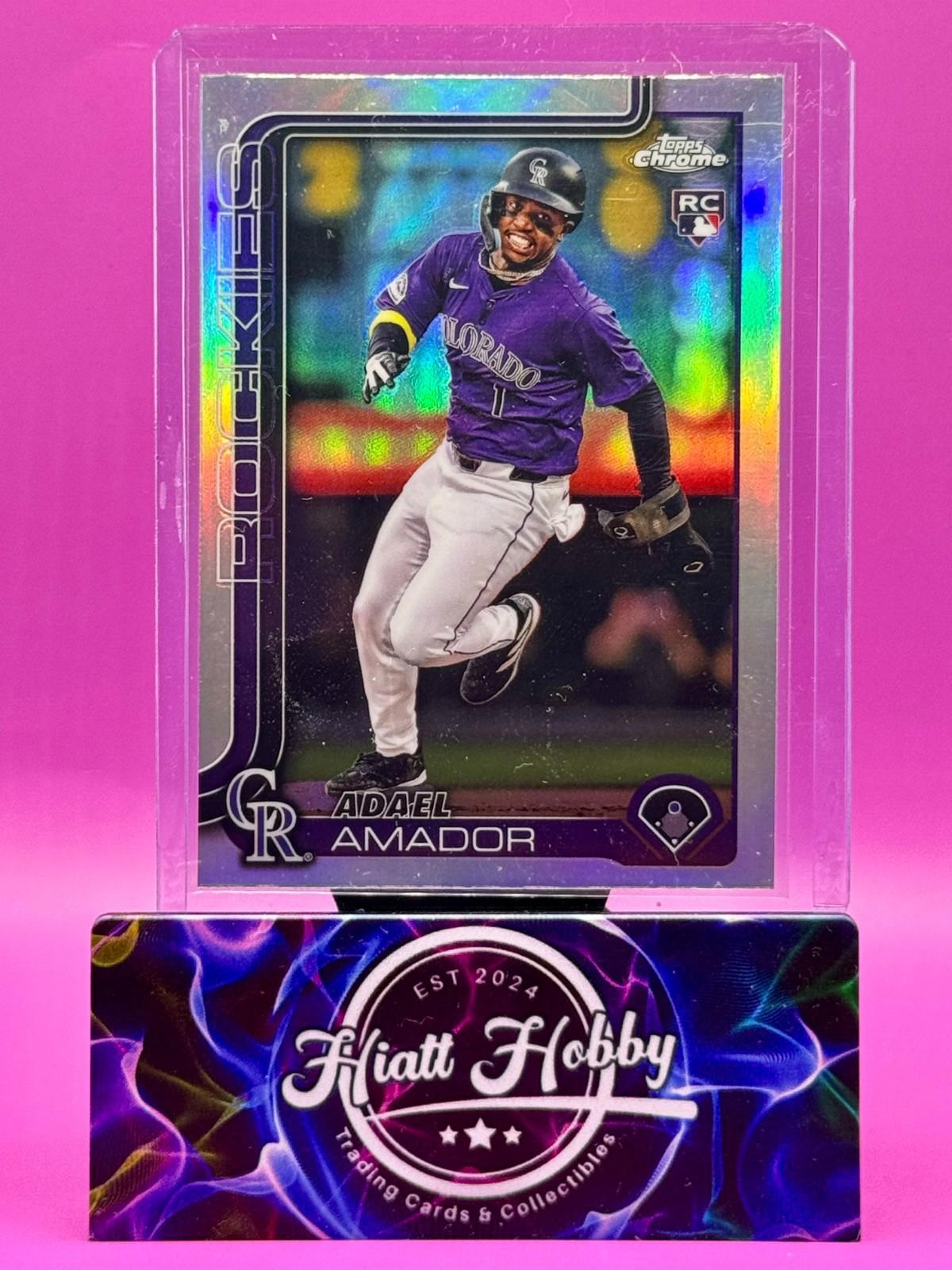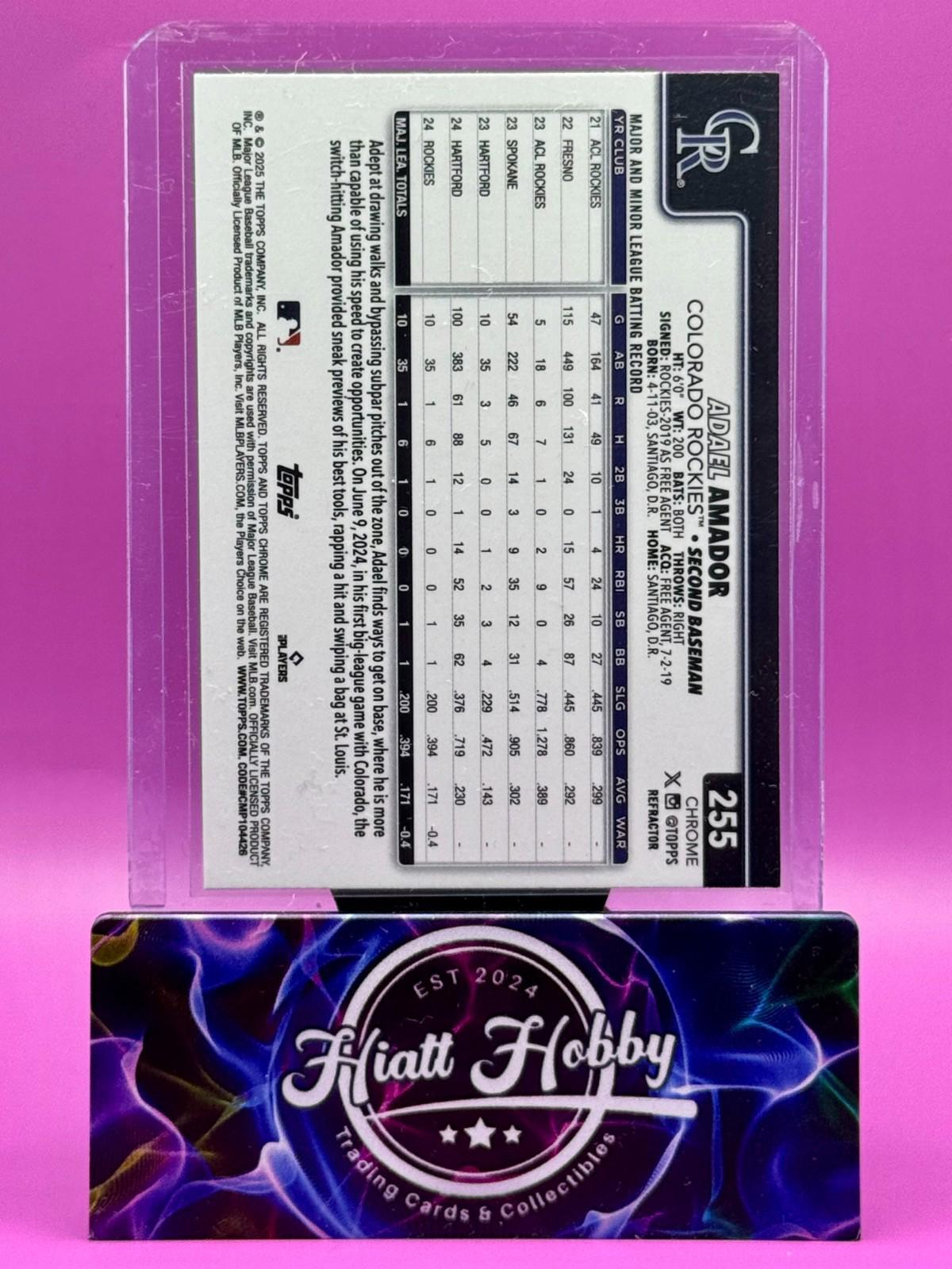 The 2025 Topps Chrome Adael Amador #255 Refractor (RC) sports trading card features a Major League Baseball player from the Colorado Rockies. This original card is made of card stock with a chrome refractor finish, making it a sought-after variety for collectors. Manufactured by Topps in the United States, this baseball trading card is a must-have for fans of the sport and collectors of MLB memorabilia.