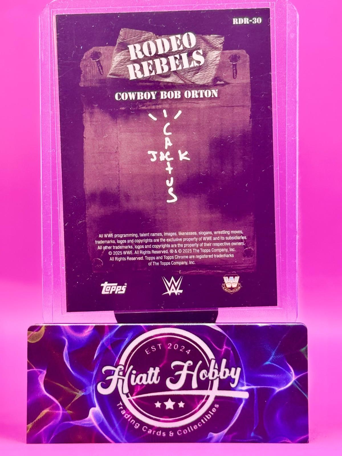 The 2025 Topps Chrome Cactus Jack WWE - Cowboy Bob Orton #RDR-30 card is a standard-sized sports trading card featuring the WWE legend Cowboy Bob Orton. Manufactured by Topps in 2025, this original card is part of the Rodeo Rebels insert set, highlighting Orton's contributions to Wrestlemania. Made of card stock with a thickness of 35 Pt., this English-language card is a part of the WWE Legends team collection, making it a sought-after item for wrestling fans and collectors alike.