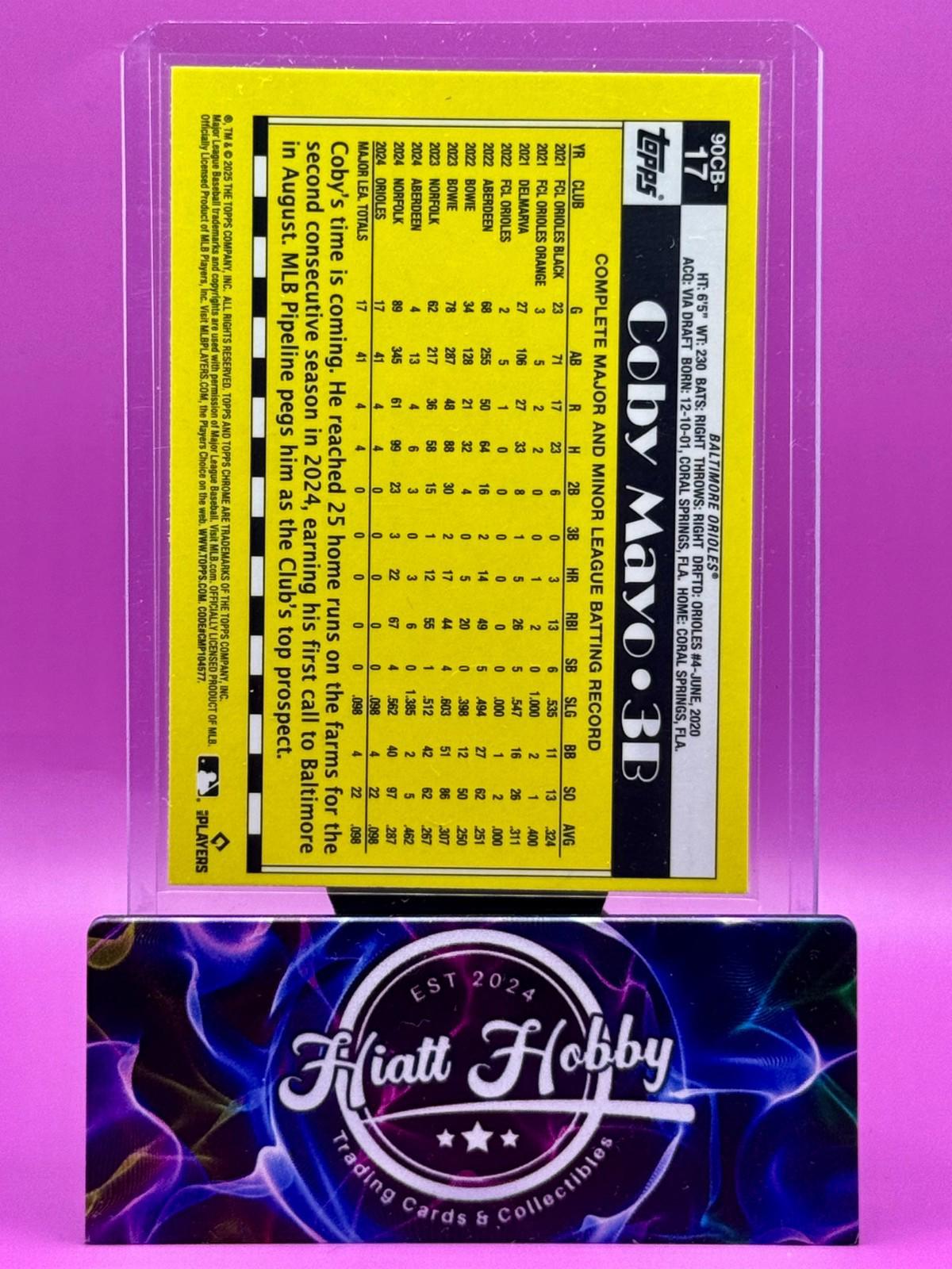 The 2025 Topps Chrome Coby Mayo #90CB-17 card is a special edition celebrating the 35th anniversary of the player. This baseball trading card features a refractor parallel variety and is part of the Major League (MLB) set for the 2025 season. Produced by Topps in the United States, this card showcases the Baltimore Orioles pitcher in English language text. Although it is not autographed, this original card is a valuable collectible for fans of Coby Mayo and baseball memorabilia.