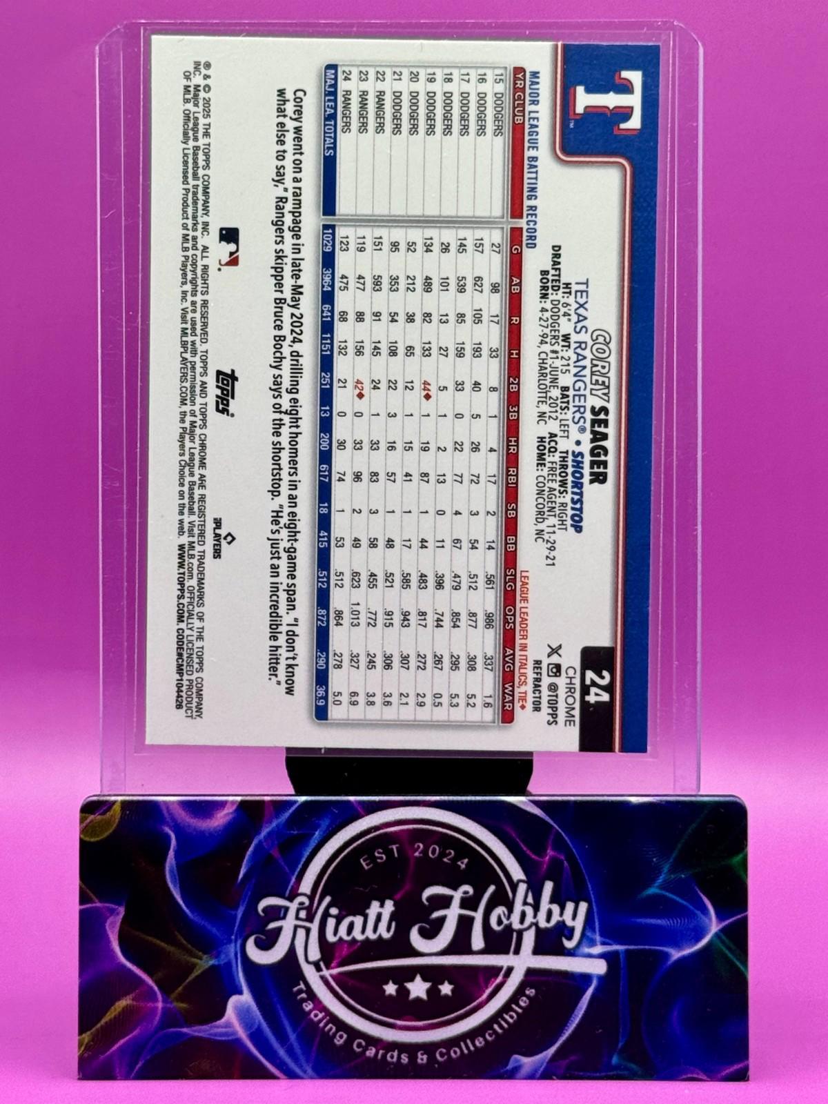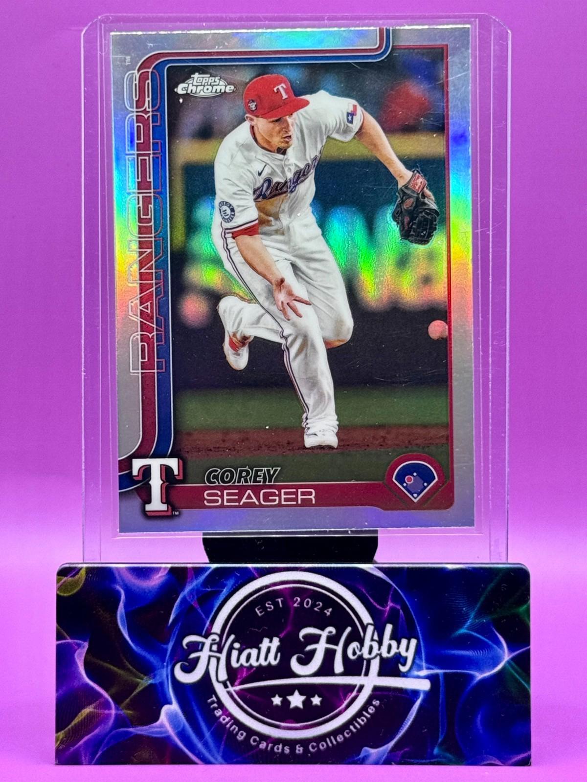 The 2025 Topps Chrome Corey Seager #24 Refractor trading card is a standard-sized card made of card stock, featuring the Major League Baseball player Corey Seager from the Texas Rangers. This original card manufactured by Topps in the United States is part of the 2025 Topps Chrome set and is a Chrome Refractor parallel variety, making it a collectible piece for baseball fans and card collectors alike. With its glossy finish and unique design, this card captures a moment in the MLB World Series season of 2025, adding value to any sports card collection.