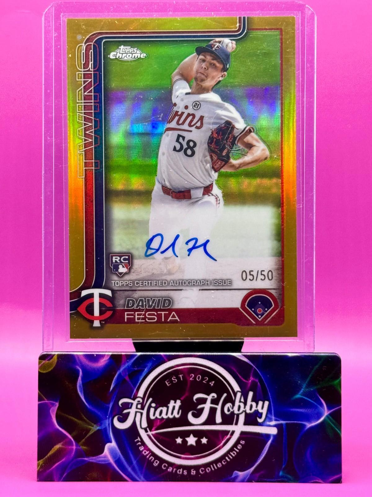 The 2025 Topps Chrome David Festa #RA-DF Gold Auto /50 is a highly collectible baseball trading card featuring a hard-signed autograph from the player himself. This rookie card, part of the Topps Chrome set, is limited to a print run of only 50 copies, making it a rare and valuable addition to any sports card collection. The card is manufactured by Topps in the United States and is authenticated by Topps, ensuring its authenticity. With features like being serial numbered and part of a parallel/variety set, this unique card is a must-have for fans of the Minnesota Twins and Major League Baseball.