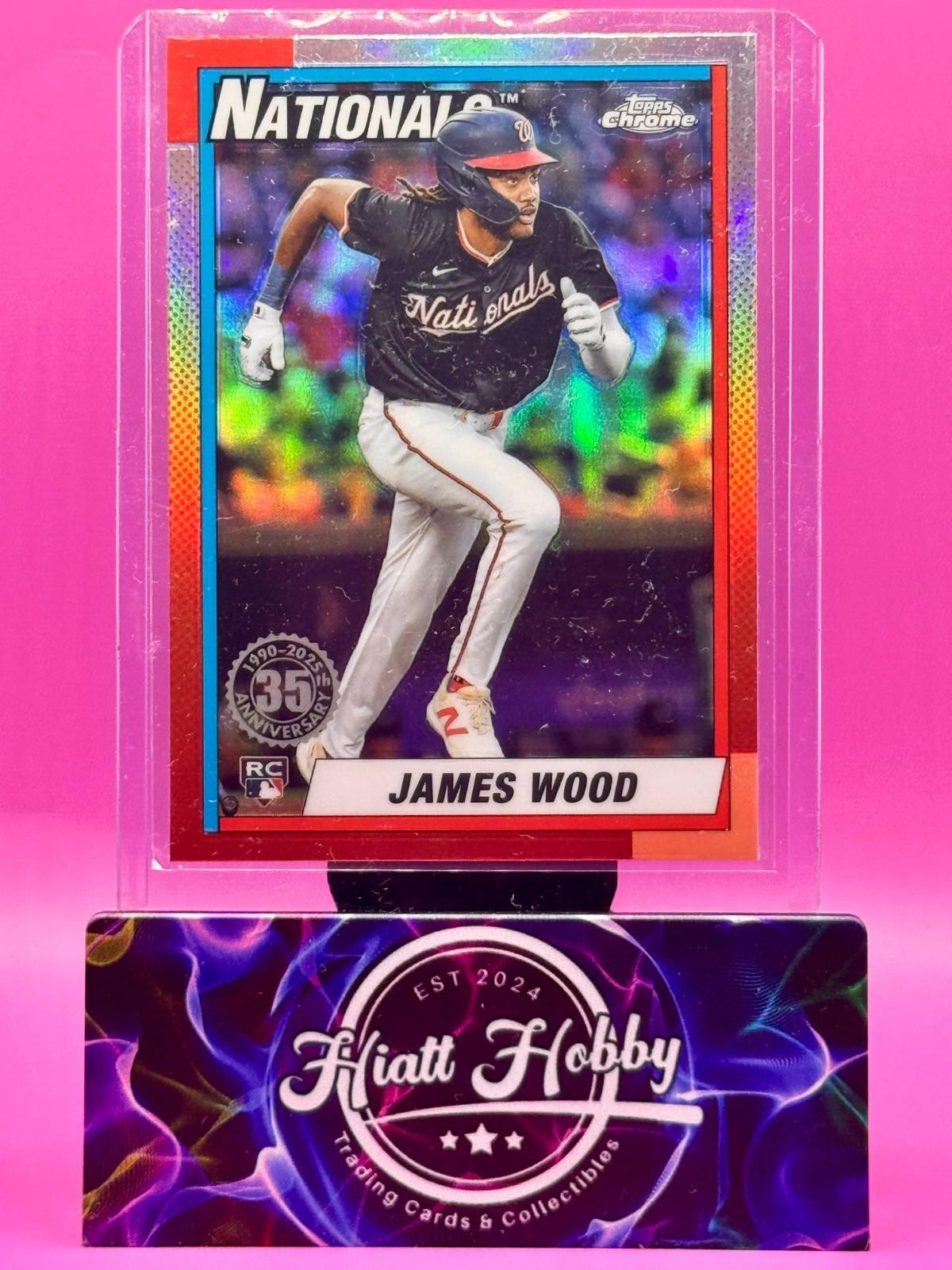 The product is a 2025 Topps Chrome baseball trading card featuring James Wood of the Washington Nationals, as part of the 35th Anniversary insert set. This rookie card is an original, English-language release by manufacturer Topps. It is a refractor parallel variety, making it a collectible item for fans of the MLB World Series and the sport of baseball. The card showcases Wood as a promising player in the Major League baseball league, providing a glimpse into his future as a notable athlete in the sport.