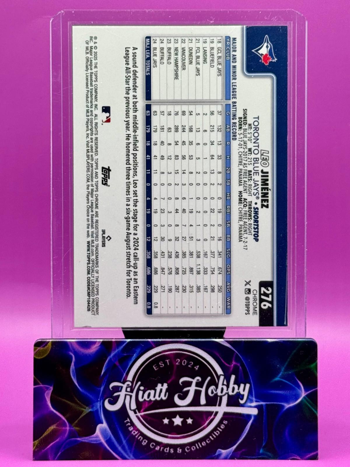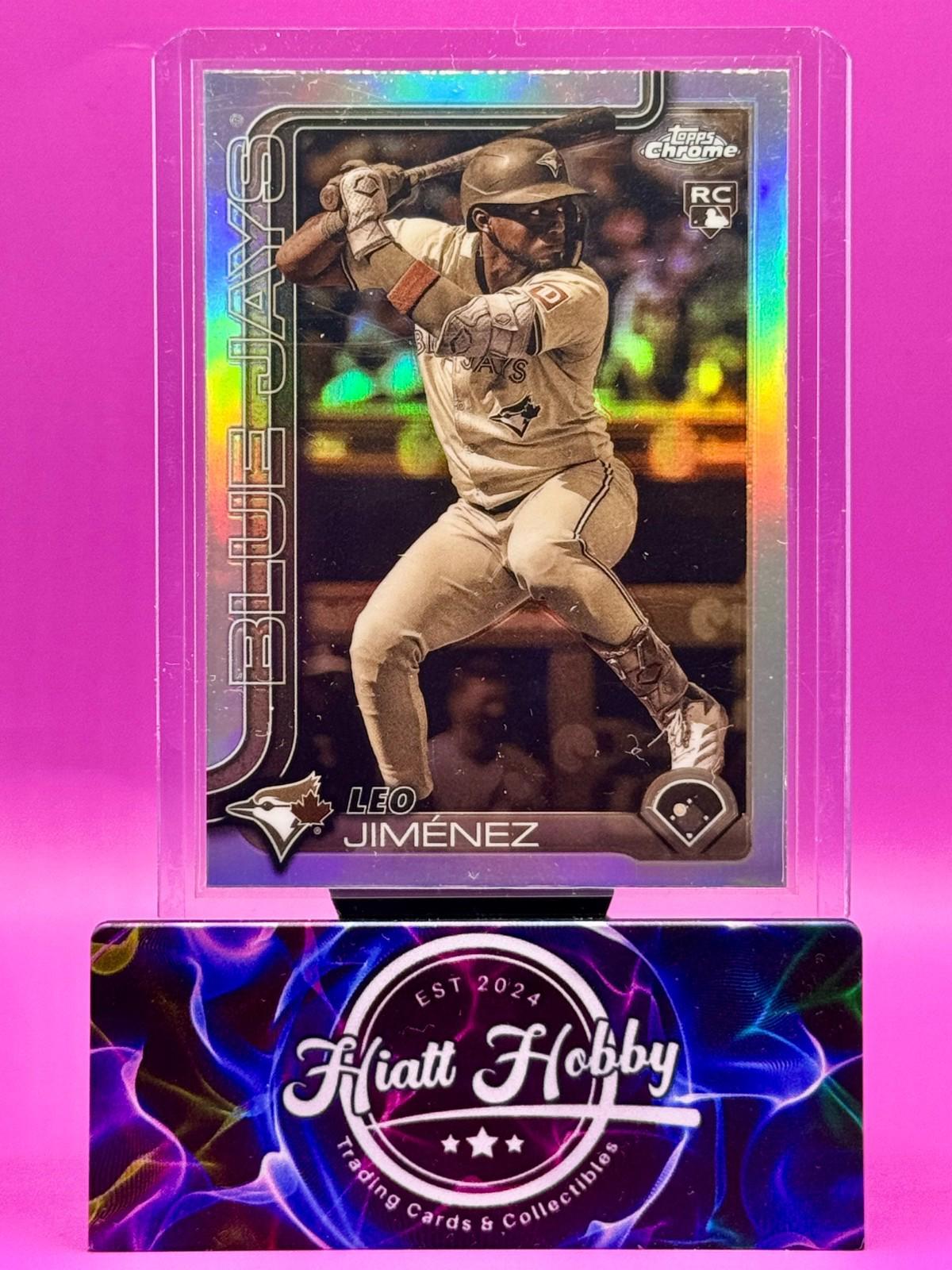 The product is a 2025 Topps Chrome Leo Jimenez #276 Sepia Refractor rookie card featuring the player from the Toronto Blue Jays. This baseball trading card is an original manufactured by Topps in the United States. The card is made of 35 Pt. card stock with a standard size and is part of the Major League (MLB) set for the 2025 season. It is a parallel variety with English language text, perfect for collectors seeking unique and rookie cards from the MLB World Series event.