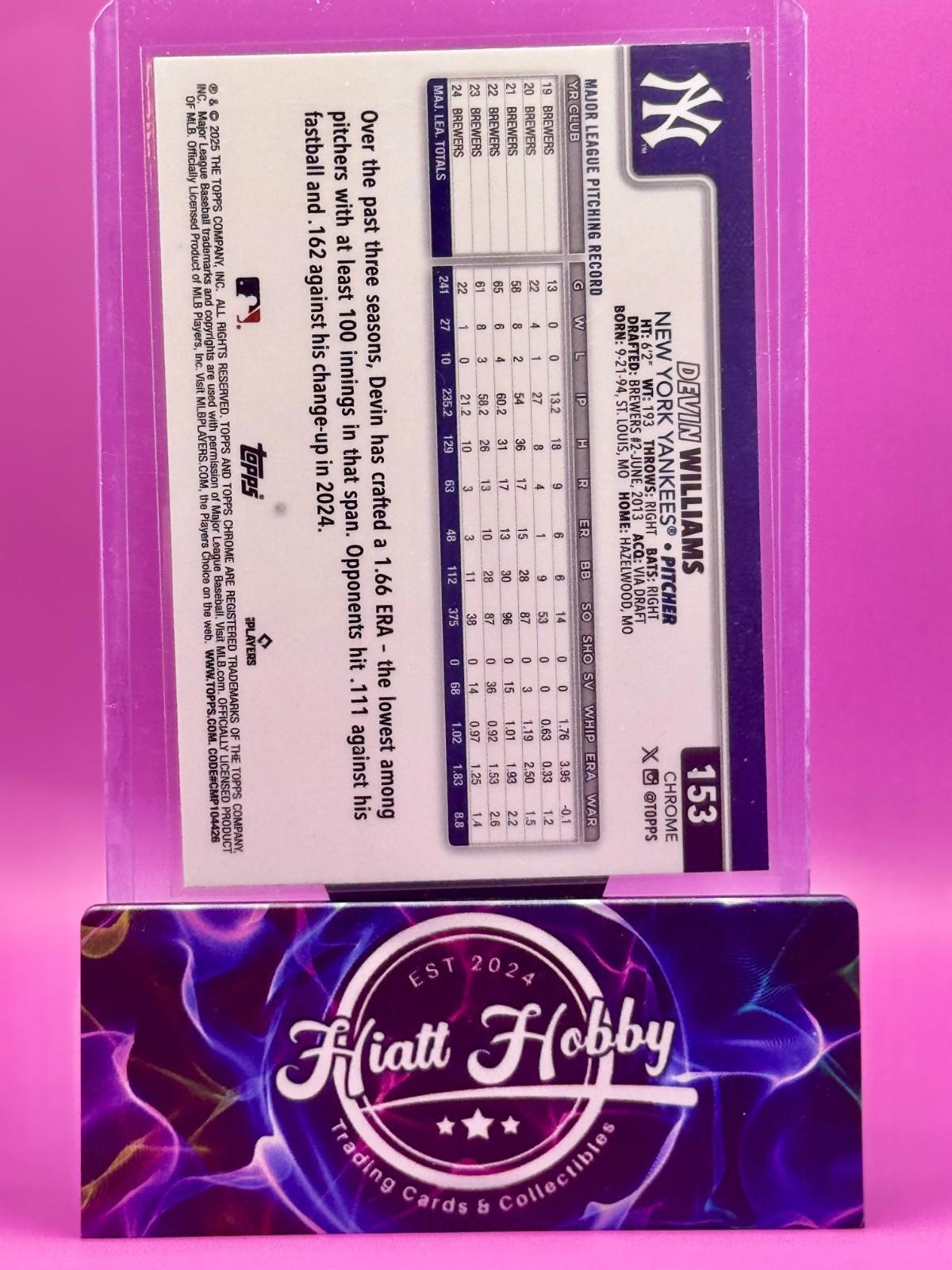 The 2025 Topps Chrome Logofractor featuring Devin Williams #153 is a standard-sized baseball trading card made of card stock. Manufactured by Topps in the United States, this original card is part of the MLB set for the 2025 season. This Logofractor variety card is a parallel and features English language text, showcasing Devin Williams of the New York Yankees as a player in the Major League (MLB) World Series. A must-have for collectors and fans of baseball memorabilia, this card is a valuable addition to any sports trading card collection.