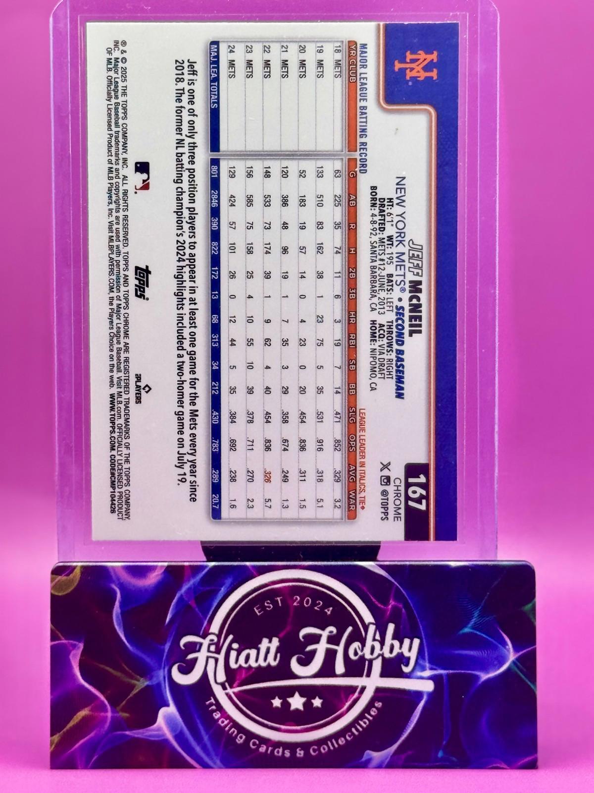 The 2025 Topps Chrome Logofractor - Jeff McNeil #167 is a standard-sized sports trading card featuring the Major League Baseball (MLB) player Jeff McNeil from the New York Mets. Manufactured by Topps in the United States, this original card is part of the 2025 Topps Chrome Logofractor set, which includes a unique Logofractor parallel variety. Made of card stock, this collectible item celebrates the MLB World Series and is a valuable addition to any baseball card collection, especially for fans of the New York Mets and Jeff McNeil.