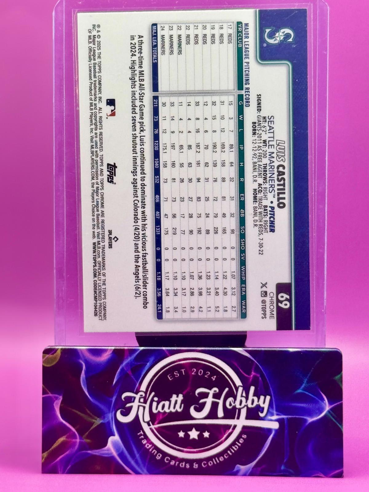 The 2025 Topps Chrome Logofractor - Luis Castillo #69 is a standard-sized sports trading card featuring Major League Baseball player Luis Castillo from the Seattle Mariners. Manufactured by Topps in 2025, this original card is made of card stock and is part of the MLB World Series event. With a Logofractor parallel variety, this English-language card is a valuable collectible for baseball fans and collectors alike.