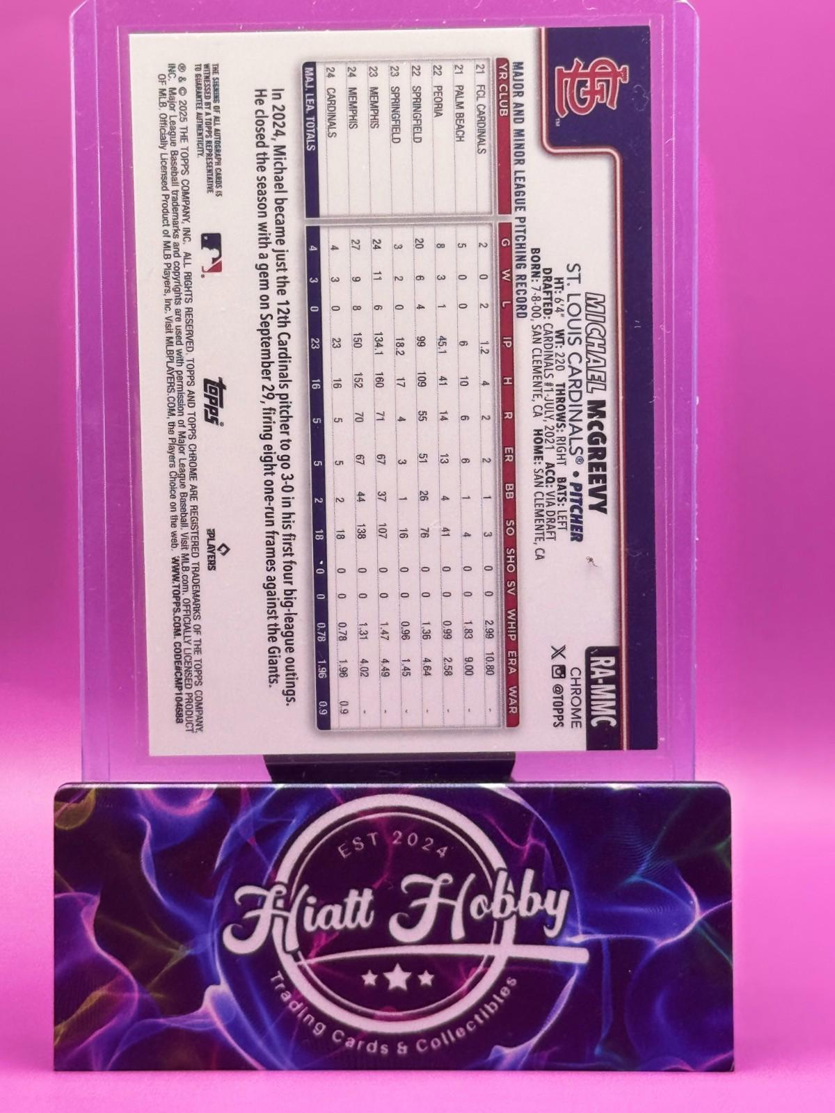 The 2025 Topps Chrome Logofractor - Michael McGreevy RA-MMC - Auto (RC, AU) is a standard-sized baseball trading card featuring an autograph from Michael McGreevy, a player from the St. Louis Cardinals. This rookie card is part of the 2025 Topps Chrome Logofractor set, manufactured by Topps in the United States. The card is hard-signed by McGreevy and authenticated by Topps, making it a valuable collectible for fans and collectors alike.
