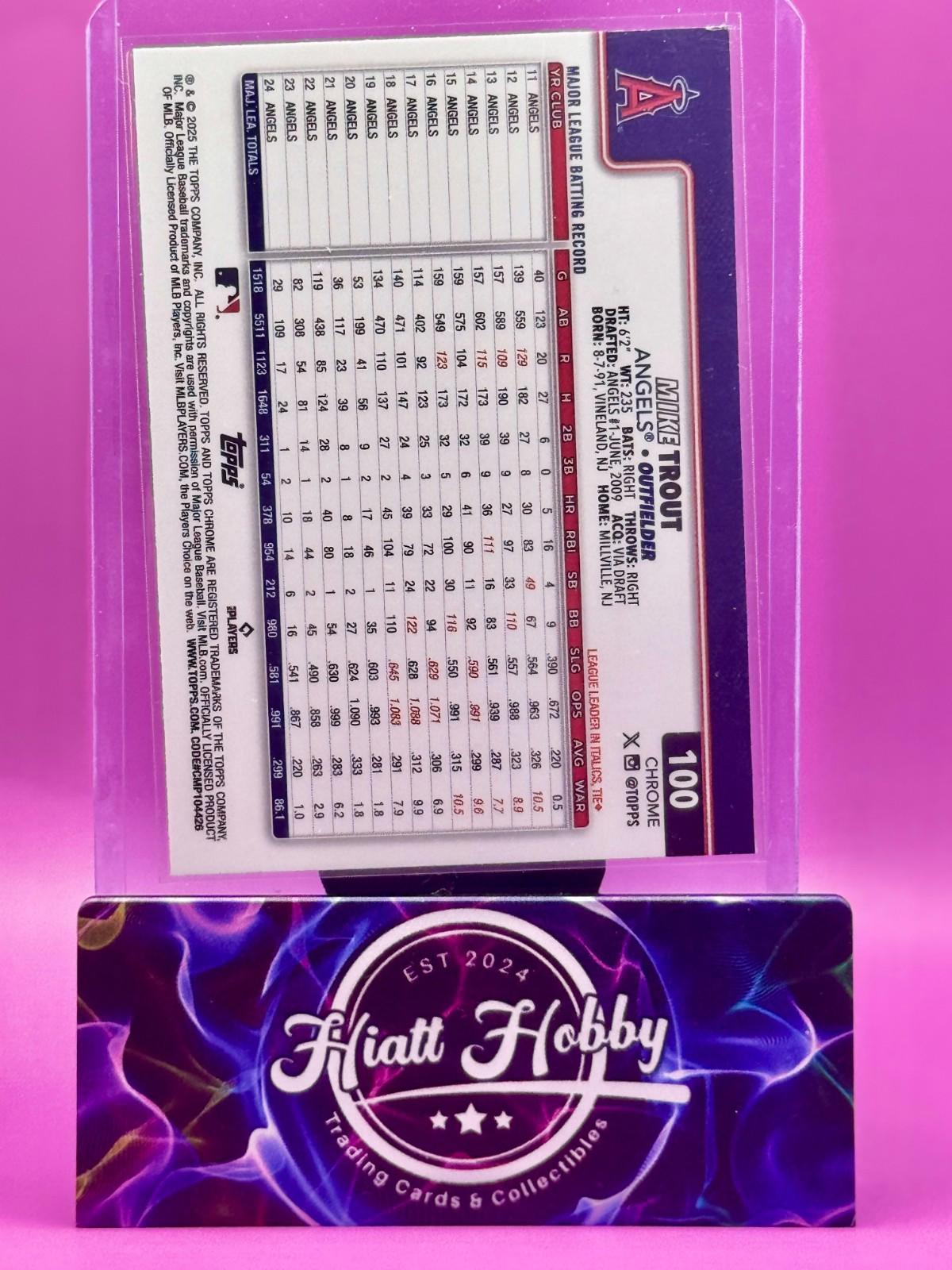 The 2025 Topps Chrome Logofractor - Mike Trout #100 is a standard-sized sports trading card featuring the Major League Baseball player Mike Trout. Manufactured by Topps in the United States, this original card is part of the 2025 Topps Chrome Logofractor set, known for its unique parallel/variety design. Representing the Los Angeles Angels, this English-language card showcases the MLB World Series event and is made of card stock material. A sought-after collectible for baseball fans and card collectors alike.