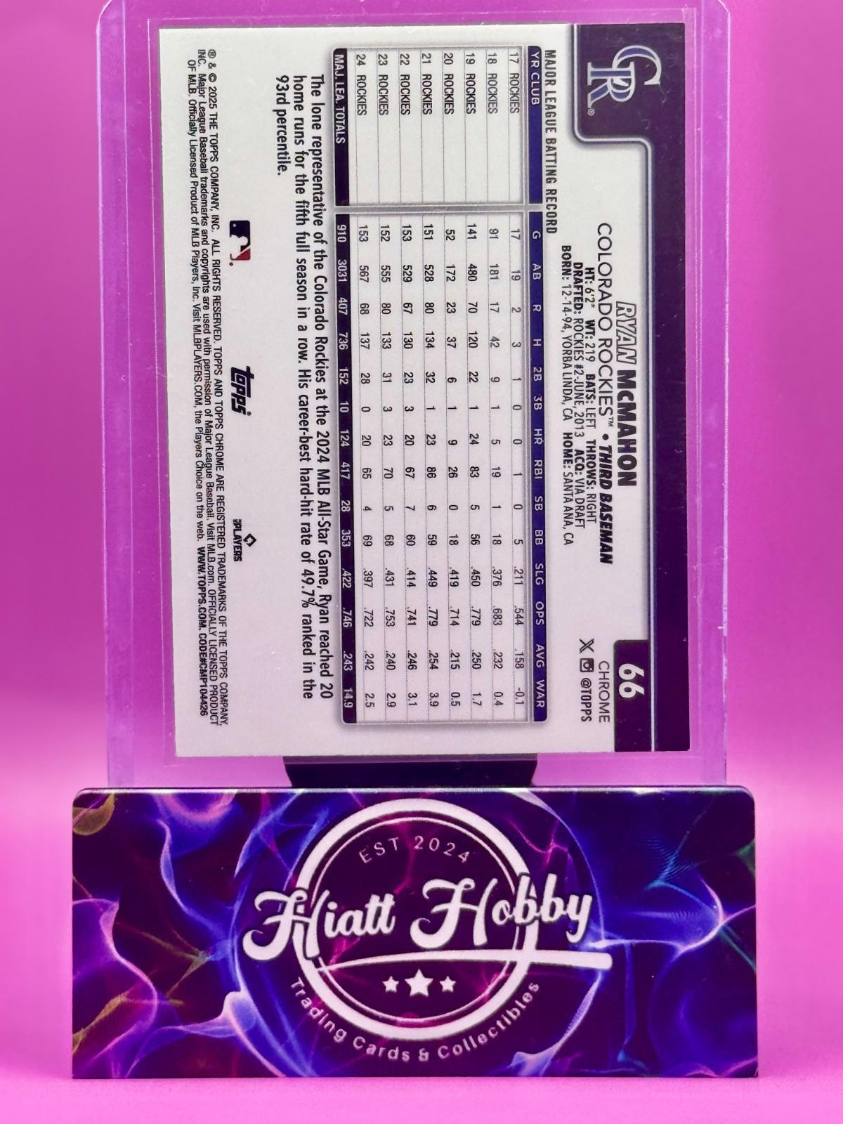 The 2025 Topps Chrome Logofractor featuring Ryan McMahon #66 is a standard-sized sports trading card manufactured by Topps. This original MLB trading card is part of the 2025 Topps Chrome Logofractor set and showcases the Colorado Rockies player in English language. With a nod to the MLB World Series, this card is a unique addition to any baseball enthusiast's collection, especially for fans of the Colorado Rockies.