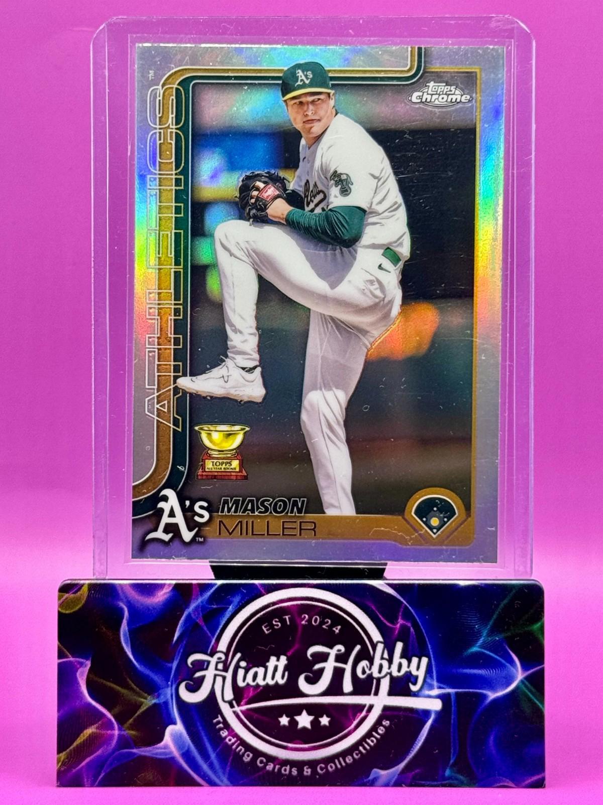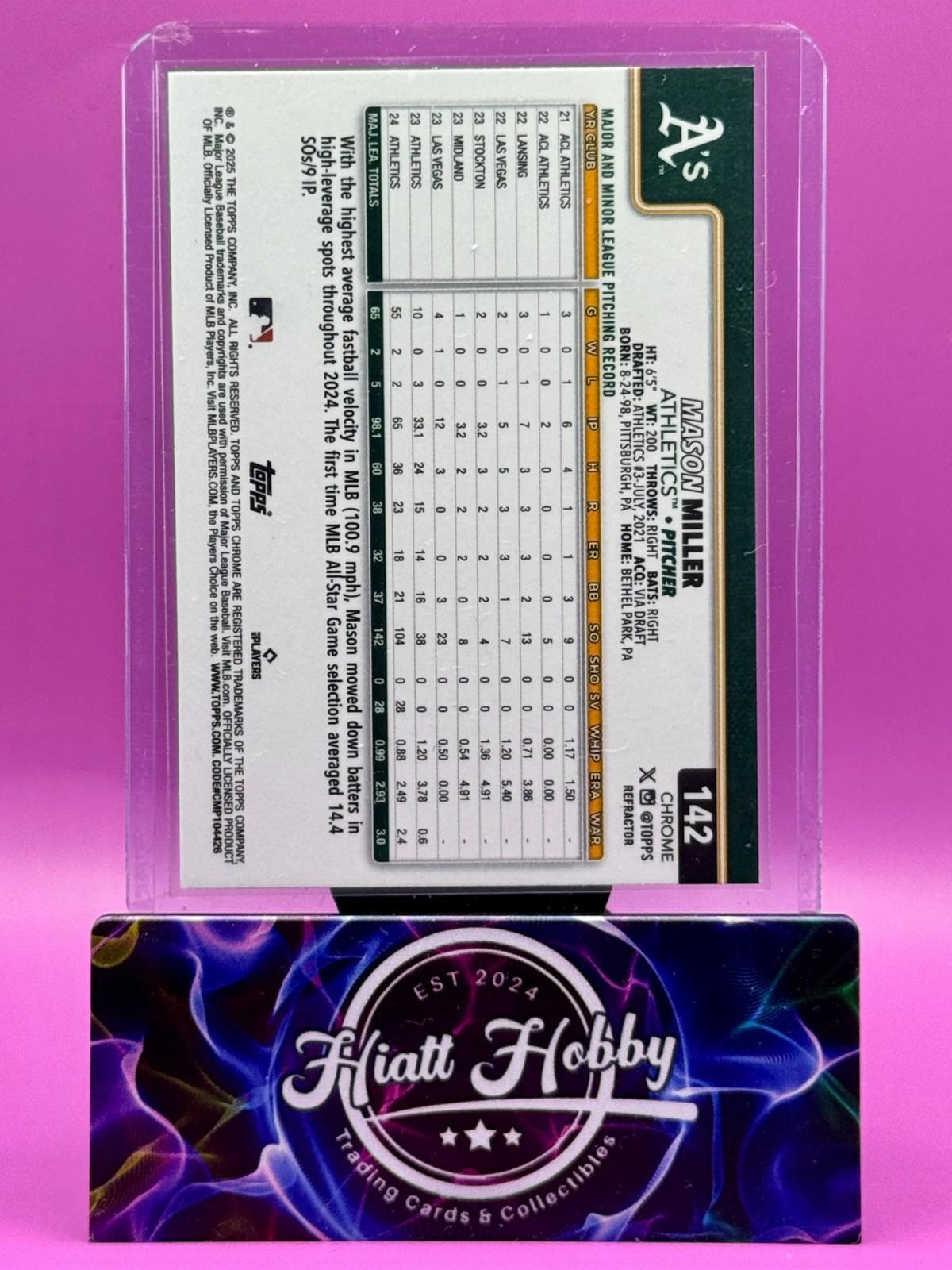 The 2025 Topps Chrome Mason Miller #142 Refractor trading card is a standard-sized card made of card stock, featuring the Major League Baseball player Mason Miller from the Athletics team. This original card is part of the 2025 Topps Chrome set and belongs to the MLB World Series event/trournament. With a chrome refractor parallel/variety, this English-language card is manufactured by Topps in the United States and has a 35 Pt. thickness. A valuable collectible for baseball fans and trading card enthusiasts alike.