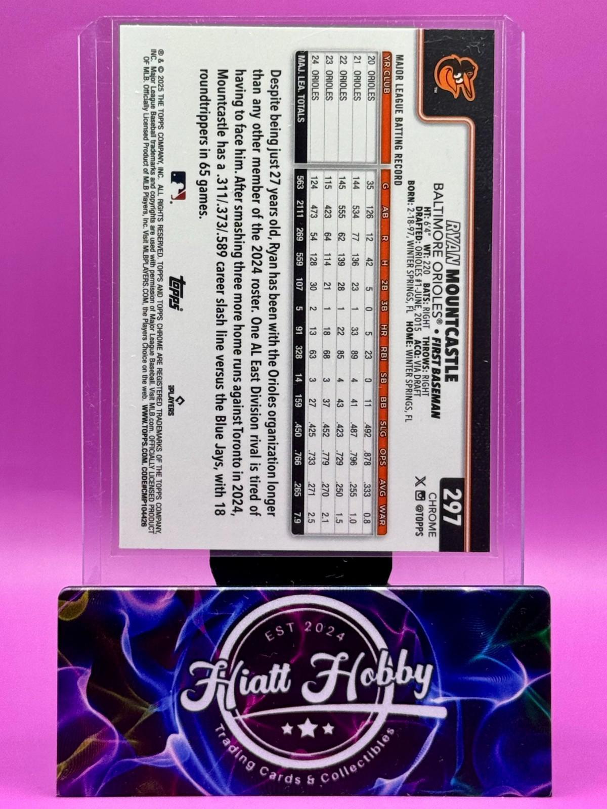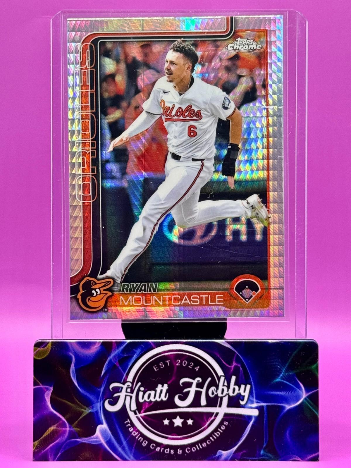 The 2025 Topps Chrome Ryan Mountcastle #297 Prism Refractor trading card is a standard-sized sports trading card featuring the Major League Baseball player from the Baltimore Orioles. Manufactured by Topps in the United States, this original card is made of card stock and is part of the 2025 Topps Chrome set. This particular card is a Prism Refractor parallel variety, adding a unique shine and design to the baseball collectible. Perfect for fans of MLB and collectors of sports memorabilia, this card captures the essence of the 2025 MLB season and the dynamic talent of Ryan Mountcastle.