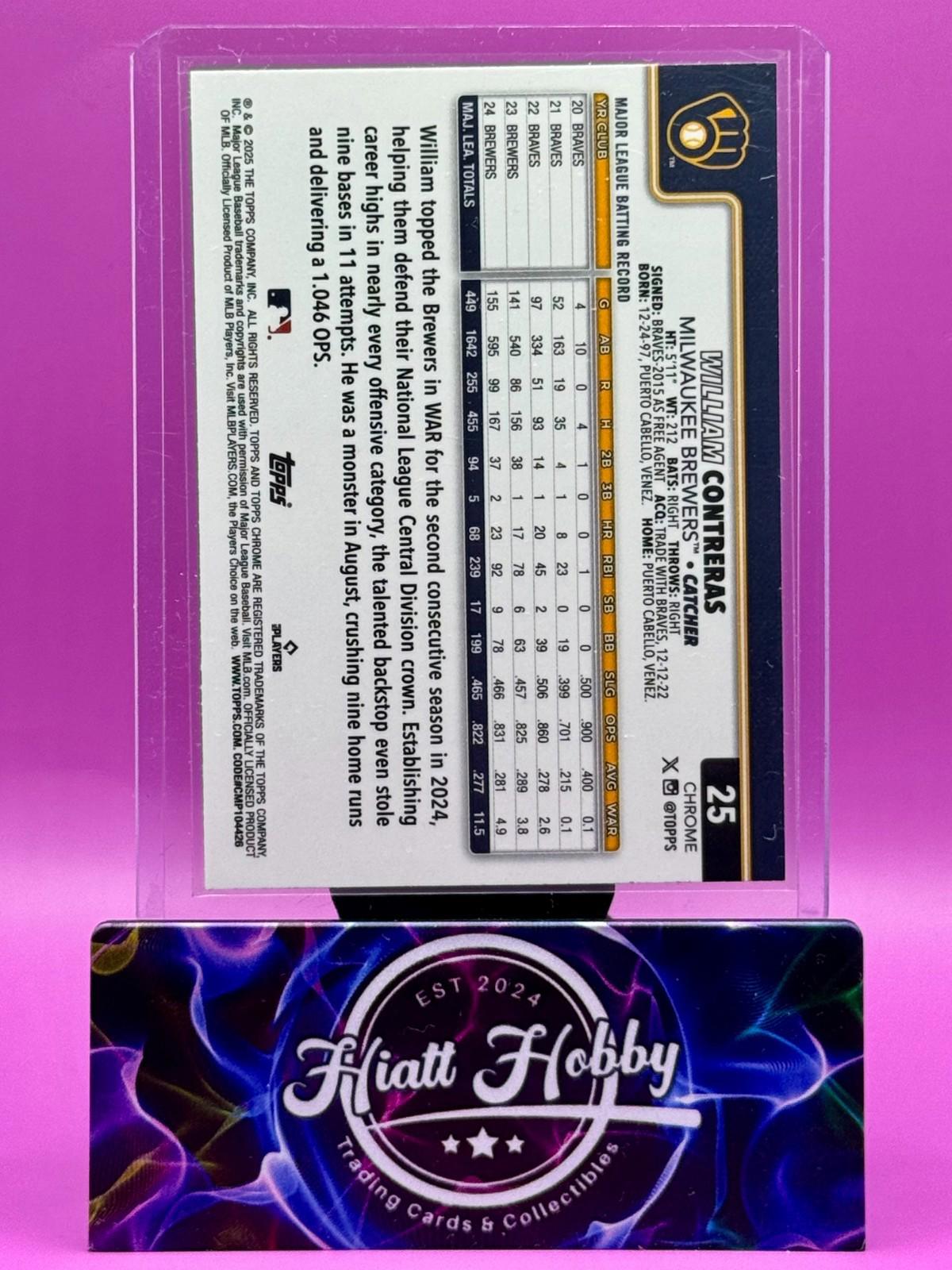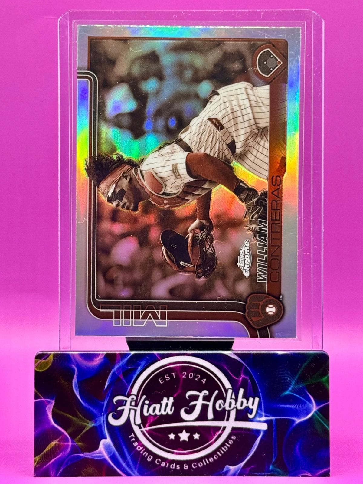 The 2025 Topps Chrome William Contreras #25 Sepia Refractor trading card is a highly collectible item for baseball fans. This card features the talented player from the Milwaukee Brewers in the Major League Baseball (MLB) championship. Manufactured by Topps, this original sports trading card is made of card stock and showcases a unique parallel variety design. With its English language text and iconic baseball imagery, this limited edition card is a must-have for any collector looking to add a valuable piece to their collection.