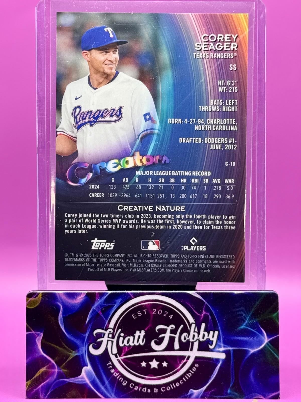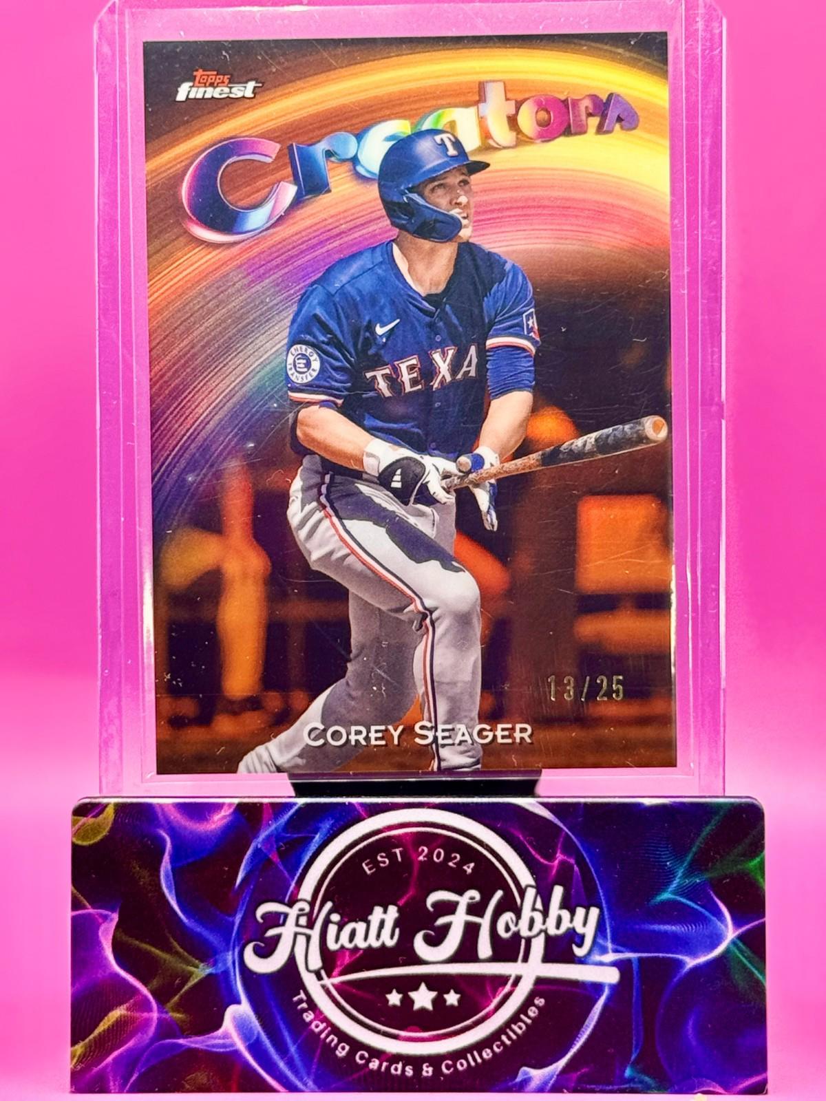 The product is a 2025 Topps Finest trading card featuring Corey Seager from the Texas Rangers. This particular card is part of the Creators insert set and is an Orange Refractor parallel, limited to only 25 copies (13/25). Made of card stock, this original MLB World Series collectible is a standard size baseball trading card in English language, manufactured by Topps in the United States. It is a valuable and unique piece for fans and collectors of sports trading cards.