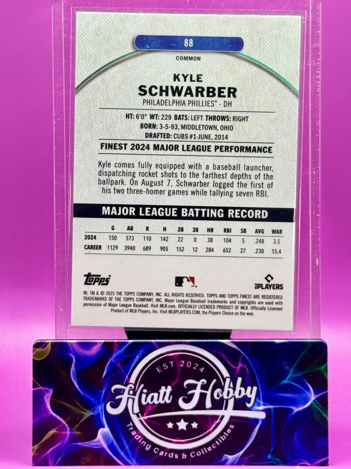 The 2025 Topps Finest Kyle Schwarber #88 X-Fractor trading card is a sought-after collectible for baseball fans and card enthusiasts. Manufactured by Topps, this original card features the talented player from the Philadelphia Phillies in the Major League (MLB). Made of sturdy card stock with a 20 Pt. thickness, this English-language sports trading card is part of the Common insert set and showcases a unique X-Fractor parallel/variety design. Perfect for fans of Kyle Schwarber and the Philadelphia Phillies, this card commemorates his participation in the MLB World Series event/tournament of the 2025 season.
